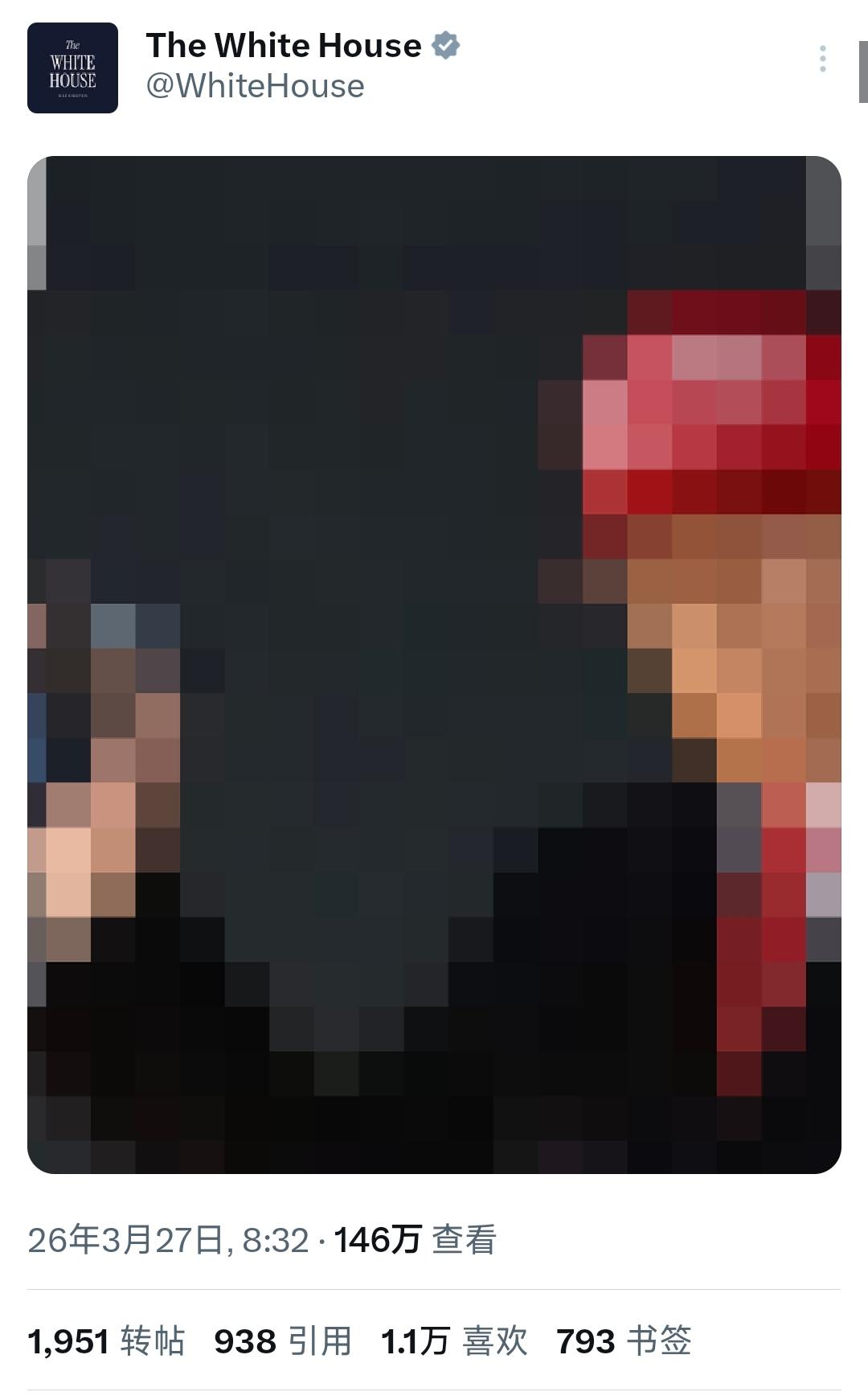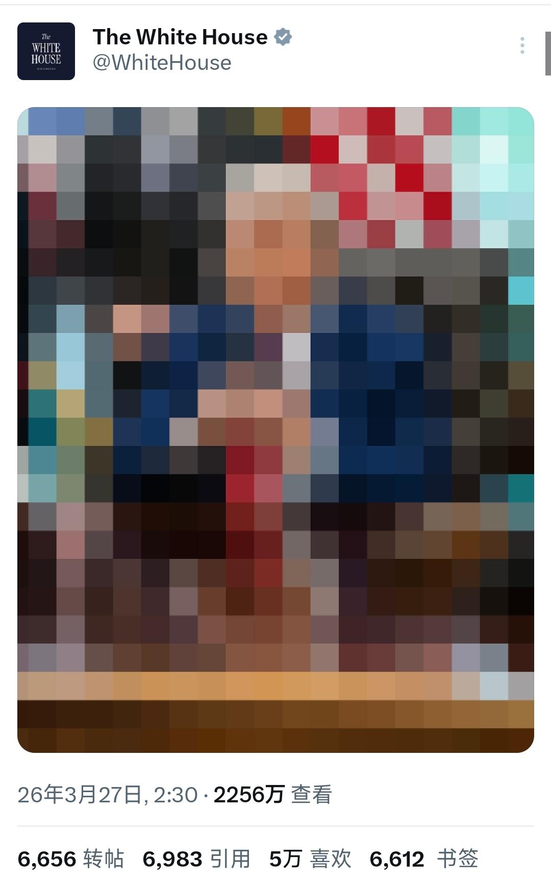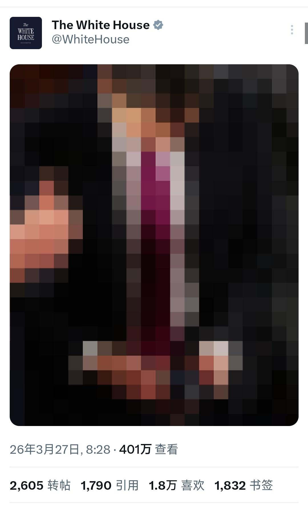 白宫官方账号3月27日这是怎么了?连着发了四个马赛克图片。为什么要给特朗普和JD万斯打这么重的码? 说真的,刷到白宫官方账号这波操作,我直接看懵了。四张图片清一色带着重码,别的地方都清晰可见,唯独特朗普和JD万斯的脸部,被遮得严严实实,几乎看不清半点轮廓。 可能有人还不清楚JD万斯是谁,他现在是美国第50任副总统,还是特朗普的竞选搭档,两人一起在2024年美国总统选举中获胜,关系十分密切。 这俩人一个是前总统、现任总统,一个是副总统,都是美国政坛的核心人物。白宫官方账号发他们的相关图片,按说应该是清晰出镜,怎么会特意打这么重的码? 先给大家说个实话,目前白宫方面还没给出明确的官方解释,咱们不能瞎猜,只能结合过往的情况,分析最有可能的原因。 回顾一下之前的事,白宫账号曾有过类似的失误。之前拜登从以色列返回美国时,白宫账号发过一张他和特种部队成员握手的照片,没做任何处理就露出了士兵的脸,引发了泄密争议,最后只能紧急删除照片,还公开道歉。 这次打码,大概率是吸取了之前的教训,加强了图片发布前的审核。要知道,特朗普和万斯的身份特殊,他们的出行、露面,往往涉及一定的安全和隐私考量。 尤其是万斯,近期还在多个公开场合露面,参与各类政治活动,他和特朗普的同框画面,可能涉及一些未完全公开的活动细节,打码或许是为了避免泄露相关信息。 还有一种可能,就是图片本身的发布规范问题。美国官方账号发布人物相关图片时,对于隐私保护和信息安全有严格要求,哪怕是核心政客,也可能因为某些特殊场景,需要进行适当遮挡。 之前就有过类似案例,美国司法部曾表示,移除相关人物照片,是出于对照片中其他人员的考虑,并非针对特定政客。 这次打码,或许也有这方面的因素,比如图片中还有其他需要保护的人员,连带特朗普和万斯一起进行了遮挡。 有人猜是不是两人之间有矛盾,白宫故意打码膈应人,这其实不太可能。万斯如今是特朗普的坚定支持者,两人近期还多次共同出席活动,不存在所谓的“内斗”导致打码的情况。 说到底,白宫官方账号作为官方发声渠道,不会随便乱操作。打这么重的码,核心还是围绕安全、隐私和发布规范这几点,毕竟之前出过泄密的纰漏,现在肯定会更加谨慎。 目前还没有官方消息确认具体原因,后续如果白宫给出解释,我会第一时间给大家更新。大家也不用过度解读,大概率就是一次常规的审核防护操作,没必要往复杂了想。
