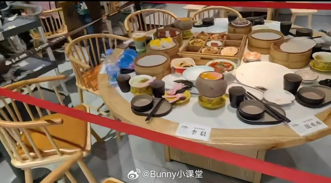 某茶楼把跑男团队吃过的残羹剩饭全留了下来,用过的纸巾餐具原封不动,甚至还标明座位