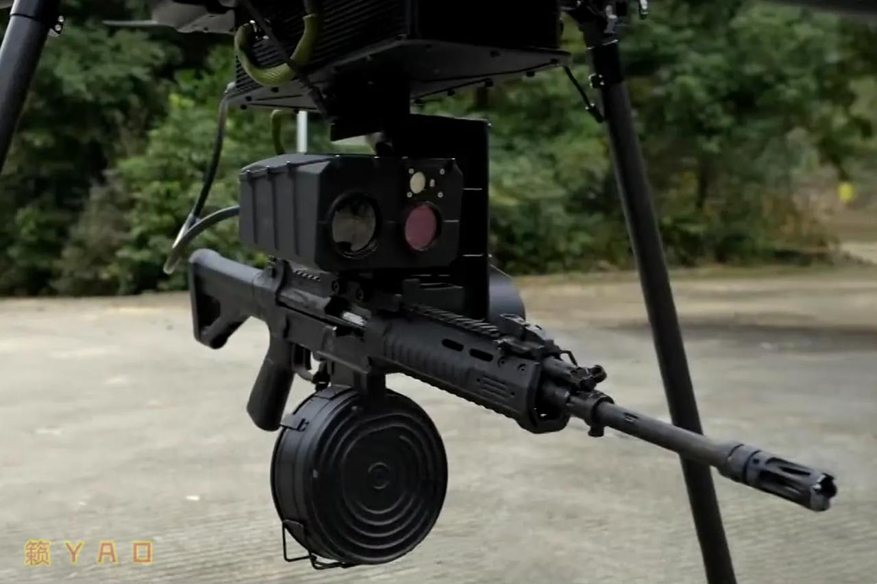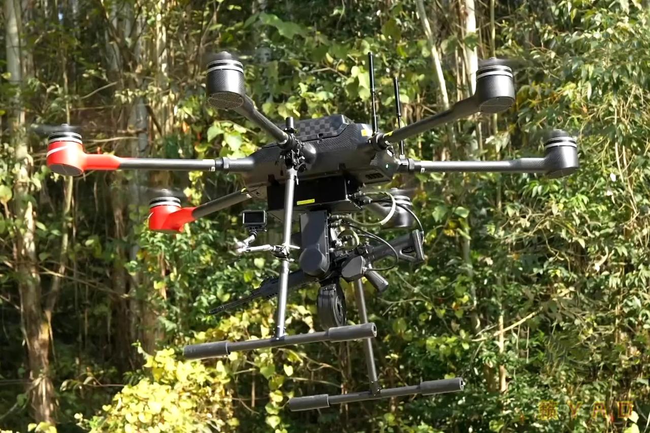 六轴无人机装上改装的191步枪,火力输出就不一样了。改装的191步枪和光电瞄准系统、伺服控制系统、扳机控制系统等集成在一起,射击灵活性、精确性非常高,具备昼夜全天候使用能力。而且供弹具采用100发弹鼓,有较好的火力持续性。