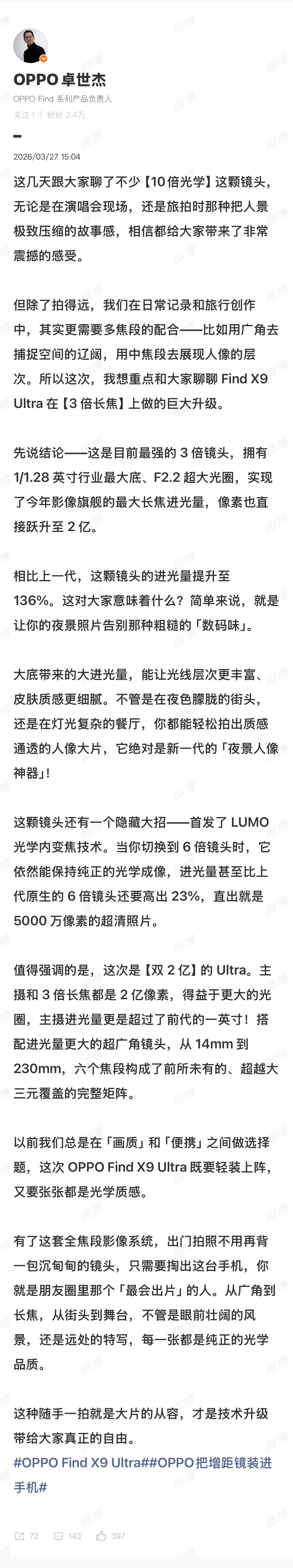 看完OPPO产品经理卓世杰最新爆料,我只有一个感受——这次OPPO Find X9 Ultra 的升级,已经不是简单的“更强了”,而是想把移动影像的体验拉到一个新阶段:手机第一次在全焦段实现了真正的原生光学画质,从主摄到长焦,每一段都是实打实的光学直出,不再依赖裁切和算法硬撑。