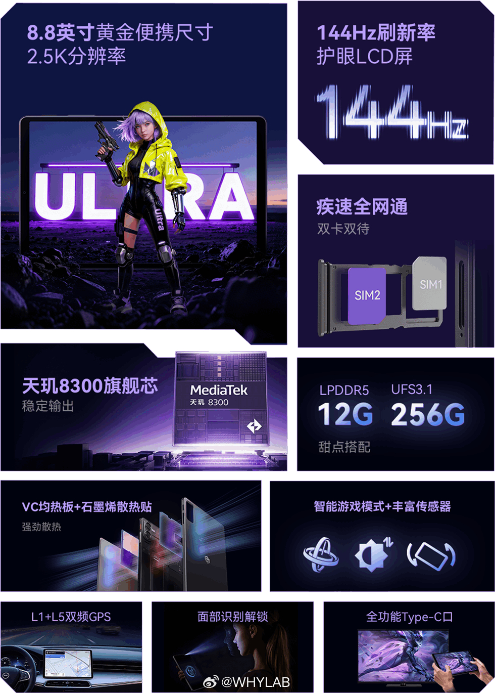 - 屏幕:8.8 英寸 2560×1600 京东方 LCD 屏幕,手动最高亮度 500nits,144Hz 刷新率,全亮度 DC 调光;