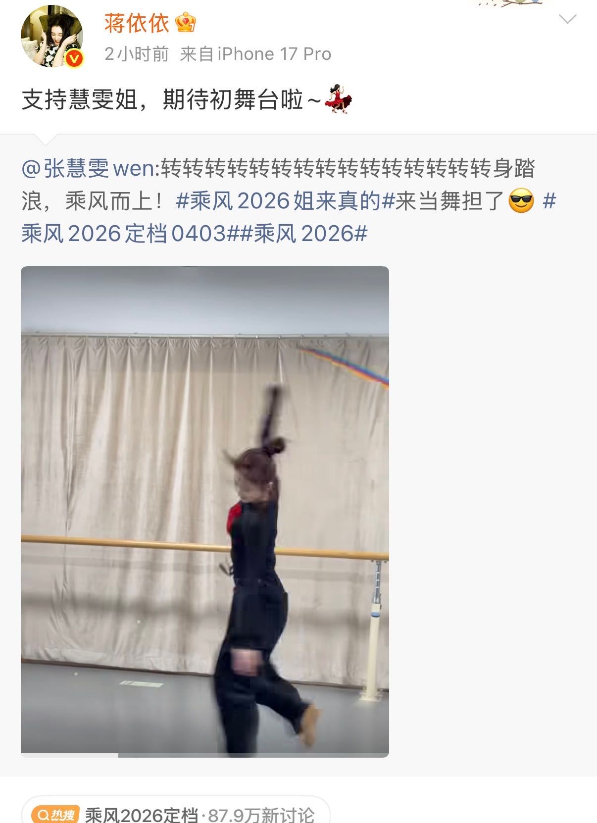 舞担就位!张慧雯官宣乘风2026 旋转展示硬核功底,娜扎、丞磊、欧豪、佟丽娅、林允、尹正、曹骏等一众艺人组团打call,气场全开坐等舞台,姐姐加油!张慧雯圈内人脉