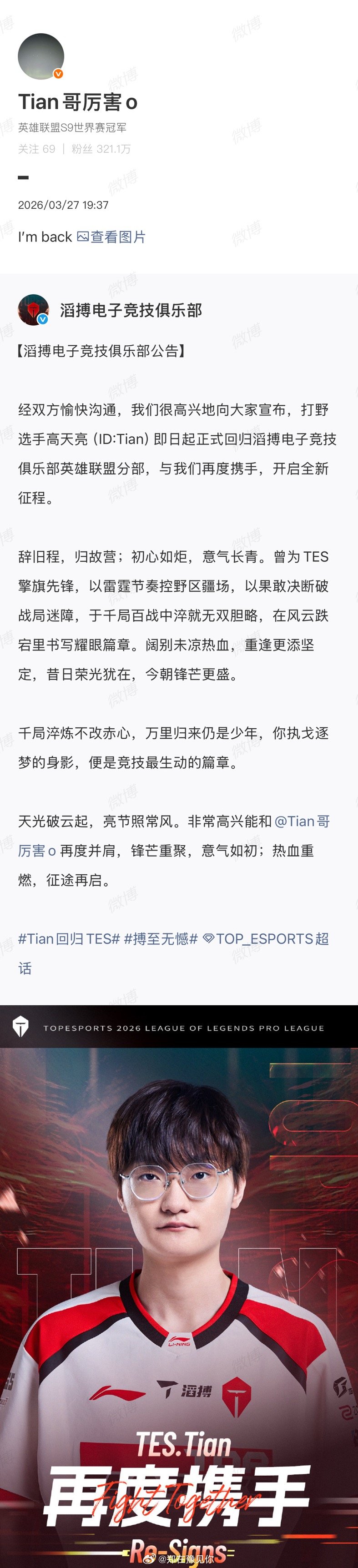 tian回应回归tes tian发文说:我回来了tian说我回来了英雄联盟