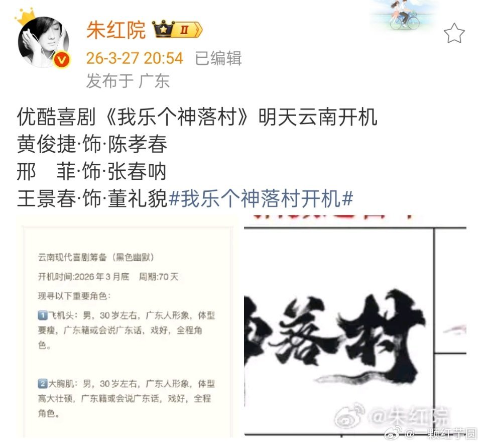 黄俊捷 新剧《我乐个神落村》明天云南开机!!配角还有王景春!这个阵容题材很不错!
