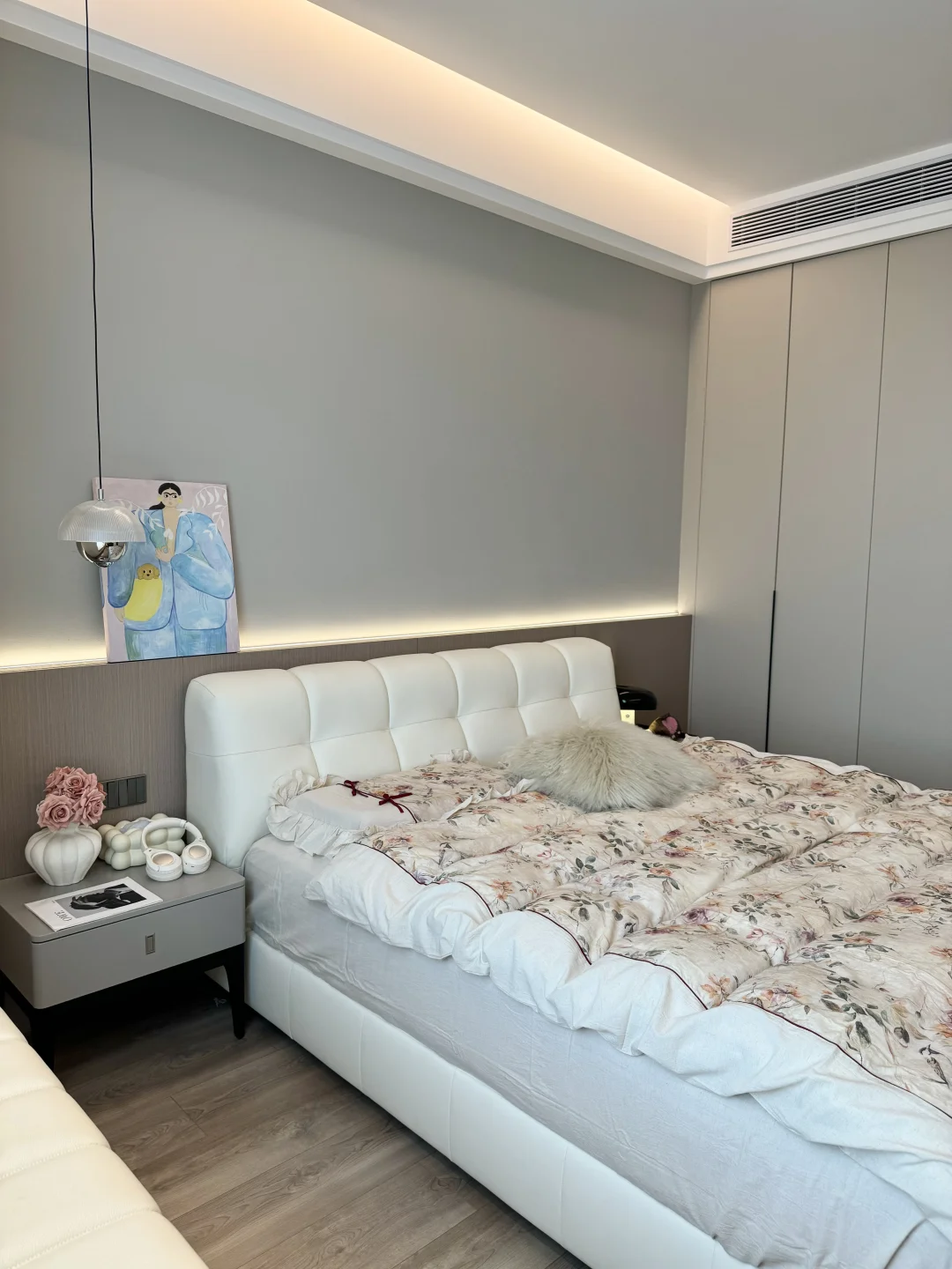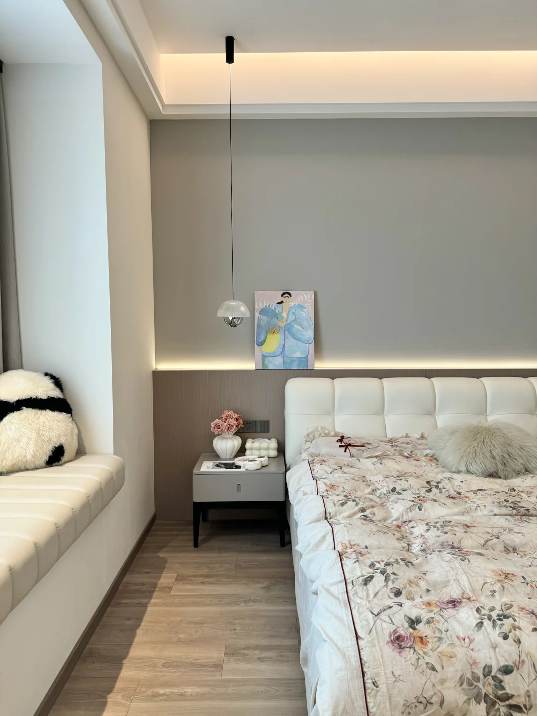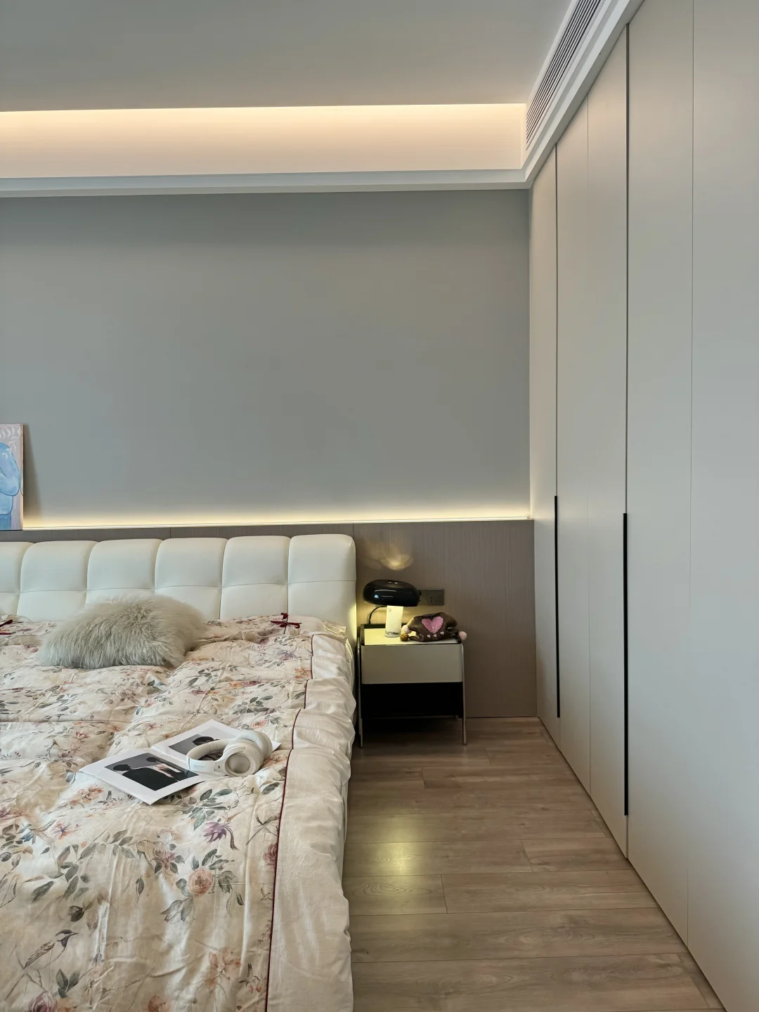 床头做了半墙背景墙:高度102cm,厚度9cm,内嵌氛围灯带,氛围感满满~