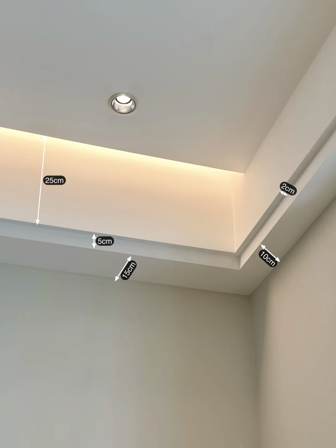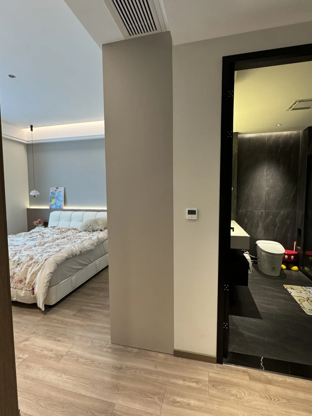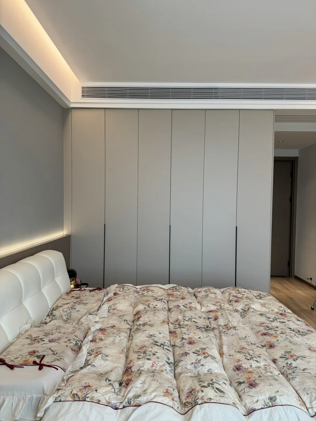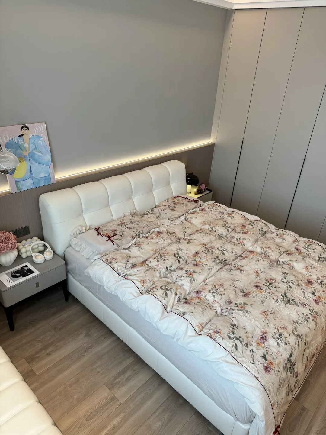 床头做了半墙背景墙:高度102cm,厚度9cm,内嵌氛围灯带,氛围感满满~
