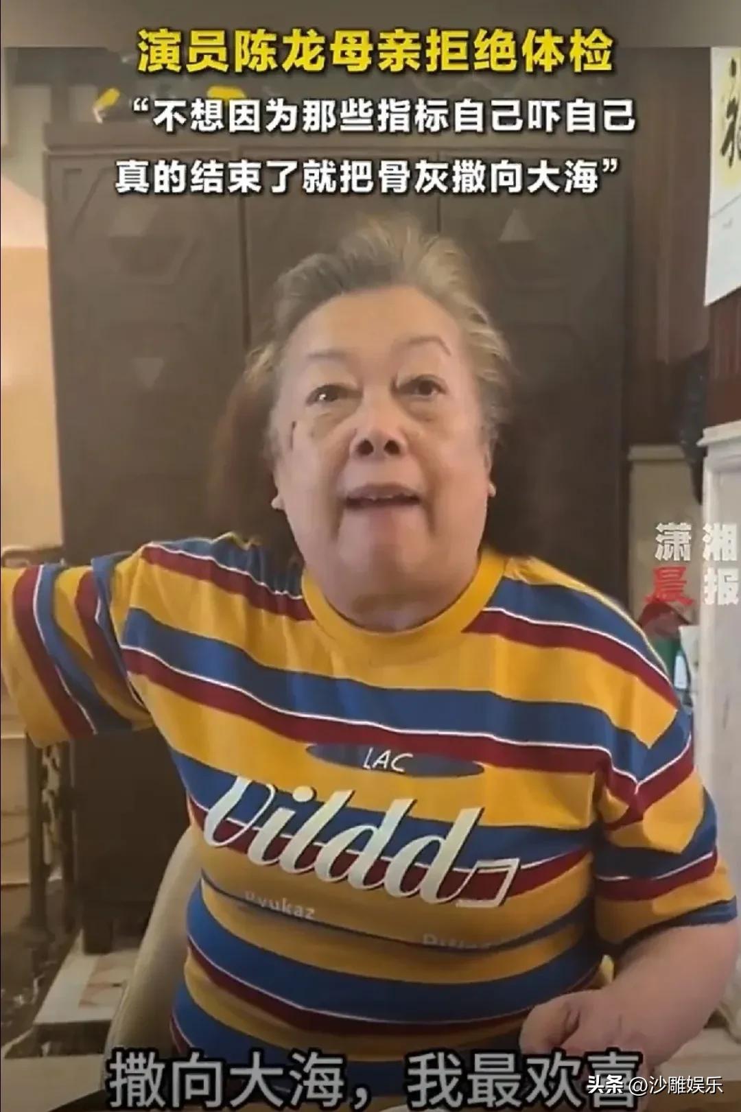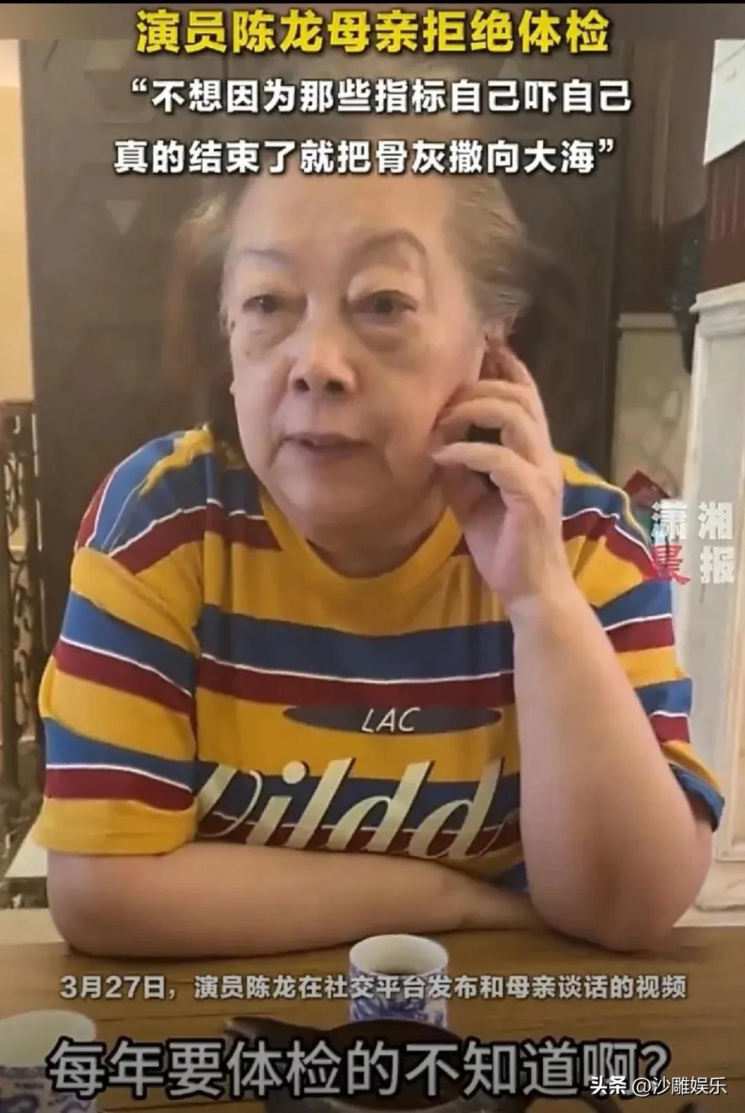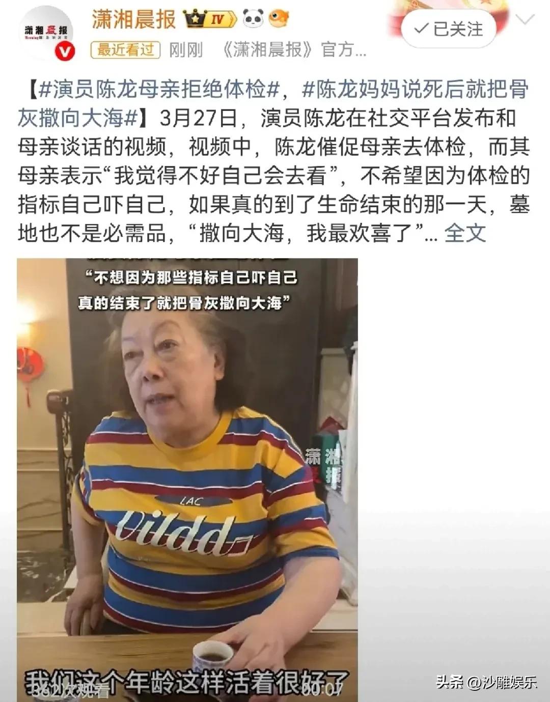 陈龙,太难了! 3月27日晚上,演员陈龙突然冲上热搜。这一次,无关新剧、无关角色,而是因为一段他“卑微催体检”的视频,直接把全网网友看破防了。 视频里,陈龙苦口婆心、一脸焦急地催母亲去医院做体检,那种“儿子式焦虑”溢出屏幕。可镜头一转,陈妈妈穿着彩色条纹T恤,端着茶杯,语气那叫一个云淡风轻: “我们这个年龄这样活着很好了,你们去体检,我自己有自己的指标。” 好家伙,一句话直接把陈龙噎了回去。 更让人愣住的是,当聊到身后事时,陈妈妈直接抛出“大海归宿论”:“墓地没必要,撒向大海,我最欢喜。”她说这话时,眼神里没有半点犹豫,反倒透着一股子通透和洒脱。 这段对话被陈龙发出来后,评论区直接炸了。 有人力挺,觉得阿姨活得清醒通透。 不被体检指标绑架,不被传统丧葬观念束缚,该吃吃该喝喝,遇事不往心里搁。“不被数据绑架,活在当下,太酷了!”有网友直言,这种豁达才是晚年最高级的活法。 也有人急了,站到了“担忧派”。“体检是对健康最基本的负责,尤其老年人,很多病早发现早干预,结果完全不一样。”还有人说得更直白:“豁达可以,但不能拿命赌。为了儿女安心,也该去查查。” 其实仔细看,陈龙对母亲的态度,根本不是“强按头”式的逼迫,而是一种子女对父母健康最本能的紧张。他在一旁急得团团转,母亲稳坐钓鱼台——这一幕,像极了无数中国家庭的日常。 而陈妈妈那句“大海论”,之所以能引发这么大争议,是因为她把很多老年人心里想过、但不敢说出口的话,直接摆到了台面上。 这一代人,经历过太多,对生命的理解有自己的尺度。他们怕的不是死,是插满管子躺在病床上的那种“活着”。陈妈妈的豁达,某种程度上是对生命质量的坚持,是对“被过度医疗”的一种温和抵抗。 但换个角度,子女的焦虑就全无道理吗?也不是。 说到底,这场“催体检”之争,本质上是两代人对“健康管理”和“生命尊严”的认知错位。子女想的是“早发现早治疗”,父母想的是“该来的躲不掉,不如舒坦过好每一天”。 还有人打趣道:“陈龙太难了,别的明星上热搜是恋情瓜,他上热搜是‘被亲妈上了一堂生死课’。” 说到底,陈妈妈的“大海论”之所以能引发这么大讨论,是因为她触碰了一个所有人都绕不开、却很少有人愿意公开聊的话题——衰老、疾病与死亡。 她用最松弛的姿态,说出了最硬核的话。这份通透,值得尊重。但尊重之余,该做的体检,其实还是可以做的。毕竟,豁达和对自己负责,从来都不是单选题。 你怎么看?