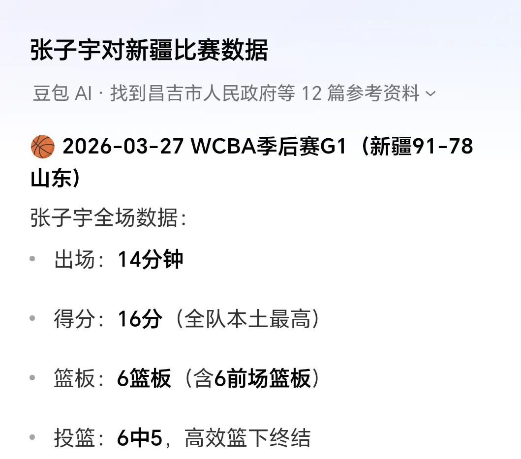 WCBA山东女篮对新疆女篮输的不冤。老问题,老情况,就是不改变,碰壁也不回头。 本场比赛,张子宇依然被侯冰主教练长时间摁在板凳上。安排张子宇出场14分钟,张子宇得到16分,拿到六个篮板,这个效率非常高,而且得分还是国内球员最高分。 为什么不围绕着张子宇设计战术,也许是不会,更多的是不愿意。 WCBA山东队这场球输球输得太正常了。女篮身高 女篮cba 女篮奇才 9号女篮 山东女篮张子宇