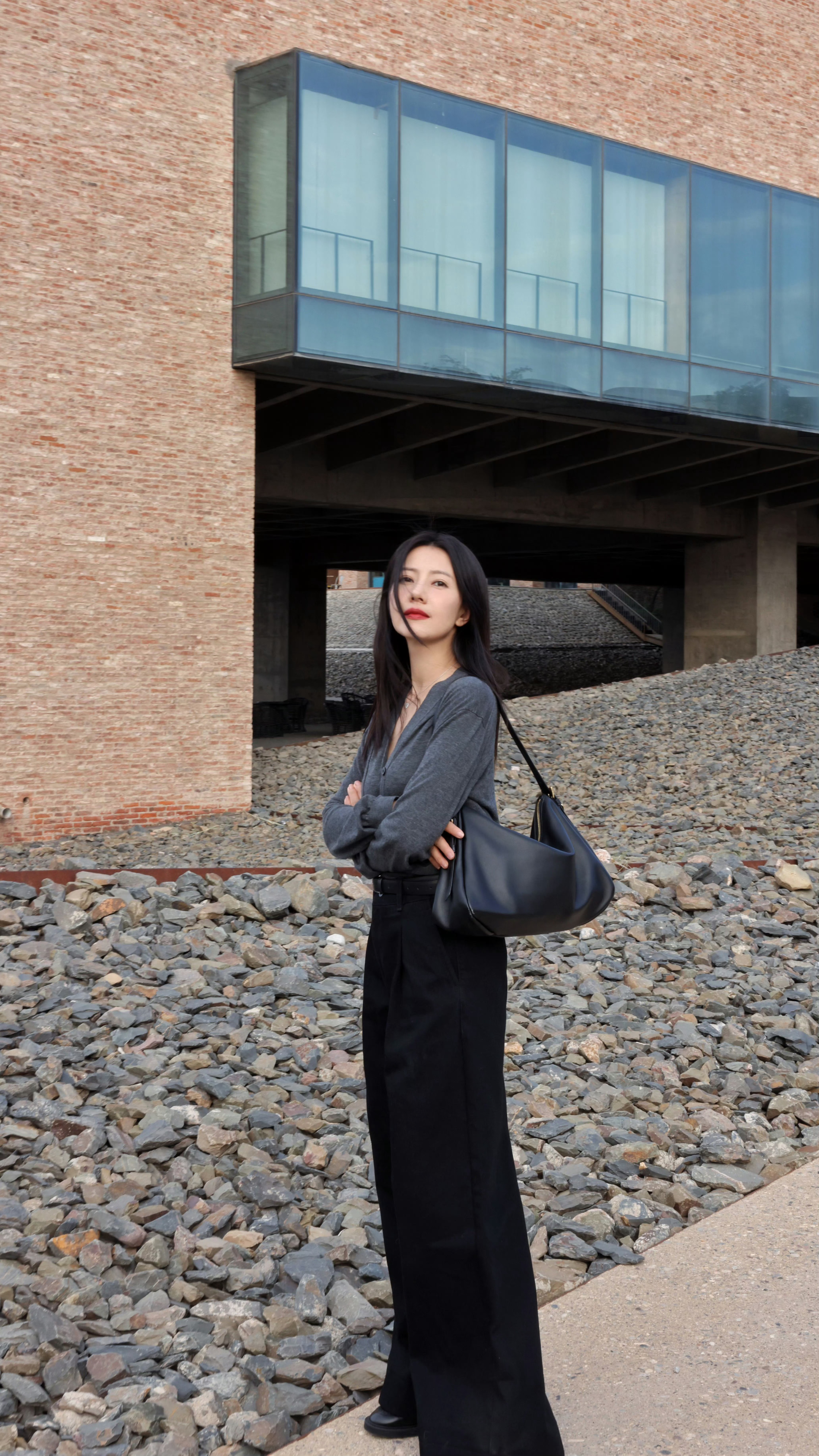 高圆圆 这组街拍也太会了!岁月沉淀的温柔✨ 灰调针织衫衬得气质清冷又柔和,黑阔腿