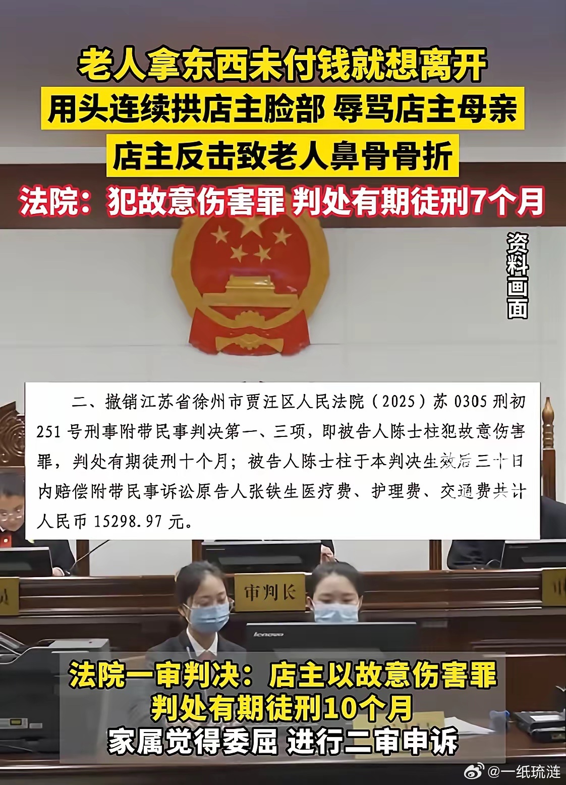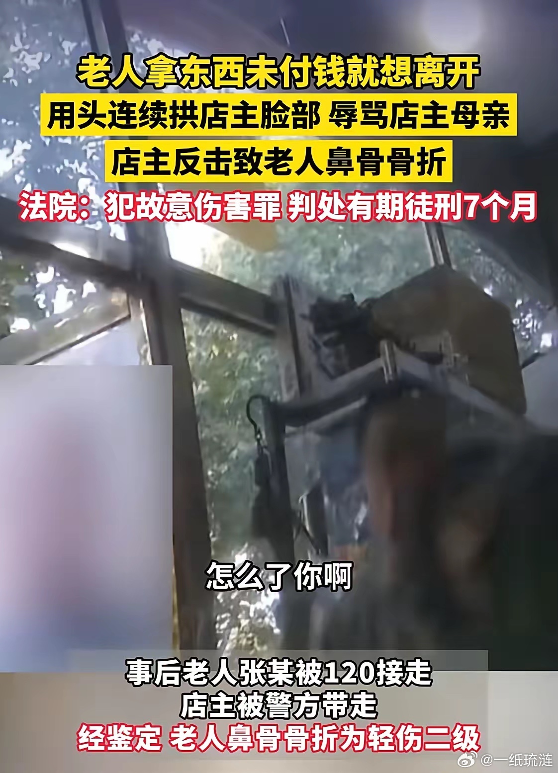 事情发生在江苏徐州,一位张姓老人到商店里让店主给他拿了一个充电器,结果没有给钱扭头就走了,店主提醒他还没有付钱,结果这位张姓老人竟然恼羞成怒的开始辱骂店主的父母,还用脑袋不停的供店主的脸部,因为店主90岁高龄的母亲刚过世,店主愤怒之下还手击打了张姓老人,事后姓老人被120拉去医院,店主也被警方带走了。张姓老人鼻骨骨折经伤情鉴定为轻伤二级,当地法院结合矛盾的起因,双方年龄、力量的对比等综合因素,一审以店主故意伤害罪判处有期徒刑10个月。店主家属觉得委屈不服提起申诉后,二审法院认为张姓老人在本案中存在一定责任故最终因店主故意伤害罪判处有期徒刑7个月赔偿老人10709.28元,一二审都没有认定店主是正当防卫,也没有认定其在现场等待是投案自首!