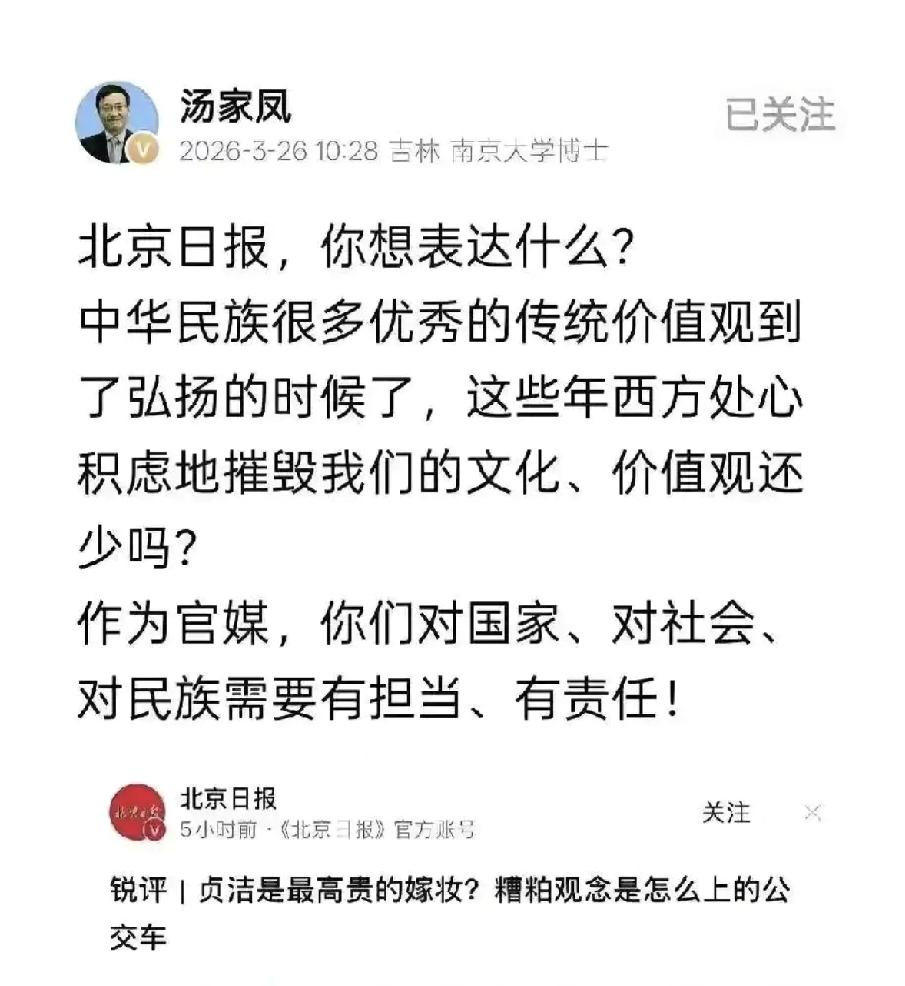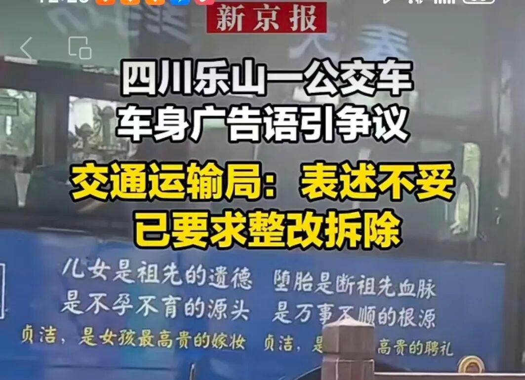 “乐山公交广告”事件,竟成了自媒体和传统媒体公开交锋的战场! 2026年3月24日,江西电视台都市频道初步报道了四川乐山井研县一辆公交车上印有争议性广告语,包括“贞洁是女孩最高贵的嫁妆”,“堕胎是断祖先血脉”等内容。 随后,新京报官微发文称:公交广告不能成了问题广告、公害广告。 接着,北京日报发布评论文章《公交车上的糟粕广告不能一拆了之》,批评该广告宣扬封建糟粕,主张不应简单拆除,而应反思其背后观念。 国内主流媒体纷纷刊发文章,抨击乐山公交广告。 次日,自媒体大V汤家凤在社交平台发文,点名批评《北京日报》、《新京报》等主流媒体对“乐山公交广告”的批判态度,得到很多网友和自媒体的支持和转发,质疑北京日报“断章取义”“双标”“迎合西方价值观”,并暗示《北京日报》等媒体的立场是“与民意背道而驰”。 一时间,网络正反激烈交锋。但上升到民族大义,国之根本,是否矫枉过正? 不管如何,公交广告语表述不妥是不容置疑的!