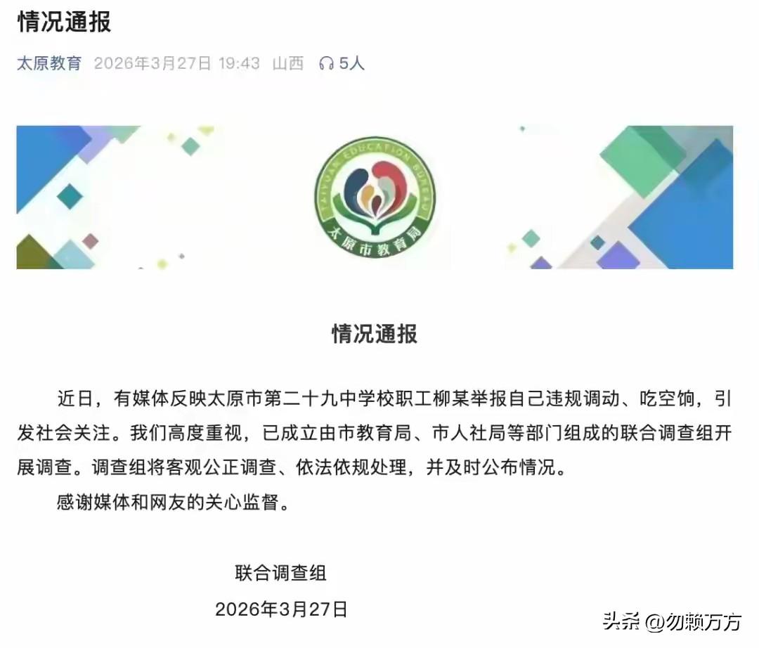 官方回应太原市第二十九中学校职工柳某举报自己违规调动、吃空饷事件,称已成立调查组开展调查。 这件事有点儿反常,如果只是单纯自省承认错误,那只需要向单位坦白,接受处罚,完全不用把事情扩大。事出反常必有妖,做出这样“自杀式袭击”式的举动,那么他的诉求应该会更高,至少超过了自身利益考虑。 调查组说感谢网友的关心监督,我觉得是应该关心一下,看能不能有个合情合理的故事,否则就枉费了当事人所付出的利益损失。[笑哭]