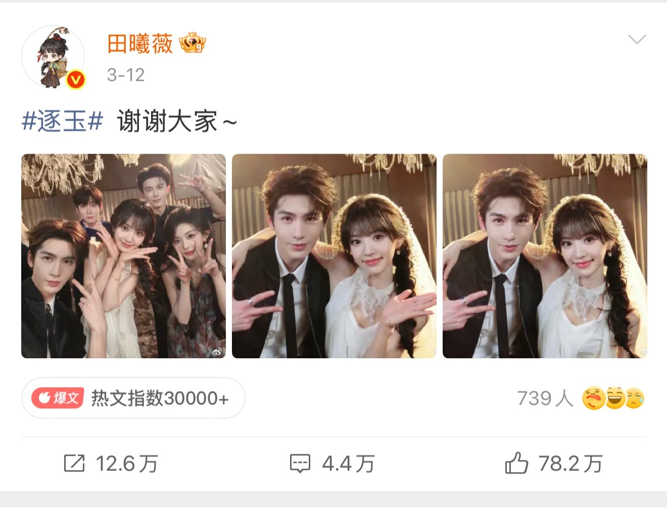 或许各位发现,田曦薇隐身了。因为人家团队在察觉不对劲的时候就悄悄选择后退/低调了啊,双平台破万的时候,两个人发博,田曦薇都没带破万词条,张凌赫带了。