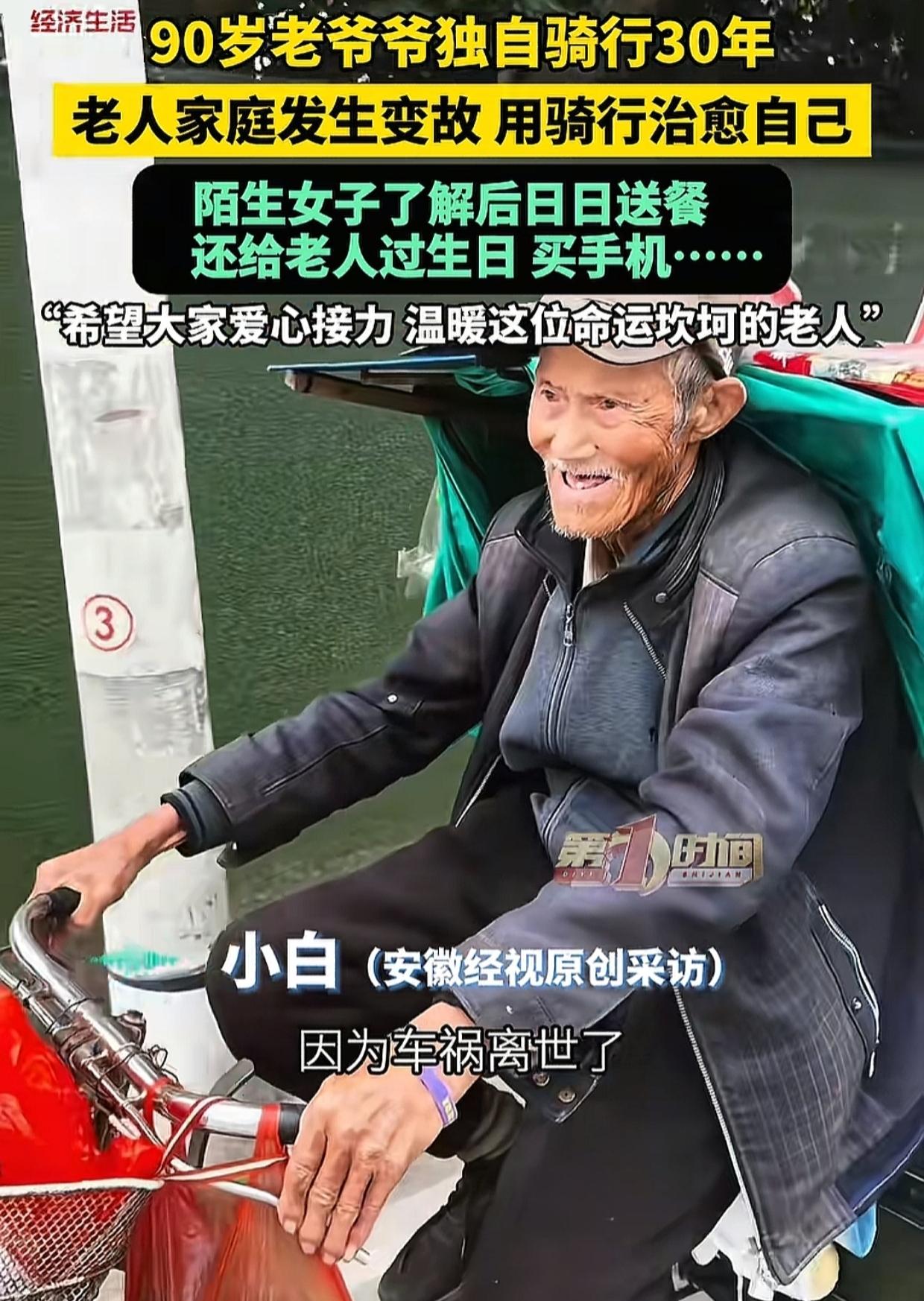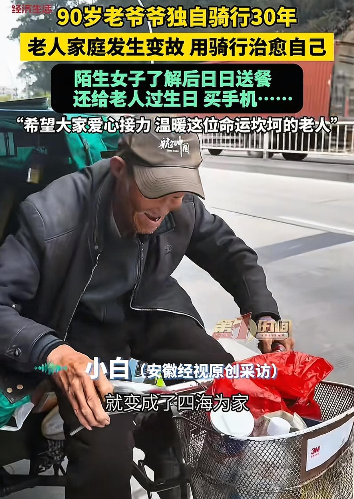 网上一位不幸的老人,儿子一家3口车祸离世,转年妻子也去世。老人为治愈自己骑行30年,四海为家,90岁了还在路上。 近日老人骑行到了福建莆田,一名女子了解到老人的情况后暖心相助,不但日日送餐,还给老人买蛋糕过生日,为了便于联系直接给老人买了一部手机,充了一年话费。 在视频中,女子拍了自己给老人送的一餐饭,有排骨有菜花还有鸡蛋糕和汤,老人坐在自己的三轮车里,埋头吃得很香。 女子拍这个视频并不是为了流量,是希望有更多的人了解老人的故事,等老人继续骑行在路上的时候,有更多的人能爱心接力,温暖这位命运坎坷的老人。 很多网友在视频下留言,希望了解老人骑行的路线,表示如果方便的话,非常愿意给老人提供衣食住行等帮助,还有人说愿意出医药费,资助老人去检查身体。 看完视频,为老人的不幸心酸,也被女子的善行温暖。 老人用30年的骑行对抗悲伤,但再长的路也化解不了心内的孤独,一个陌生人家人一般的牵挂和照顾,带给老人的温暖治愈远比物质本身更珍贵。 生活中总有人经历苦难,共情到他人的苦难掬一把同情泪容易,可像女子一样用实际行动去表达善良的温度并不容易。 真心希望有更多人被女子的善行感召,在老人孤单的骑行路上提供力所能及的帮助,让老人不再孤单,被满满的爱拥抱!