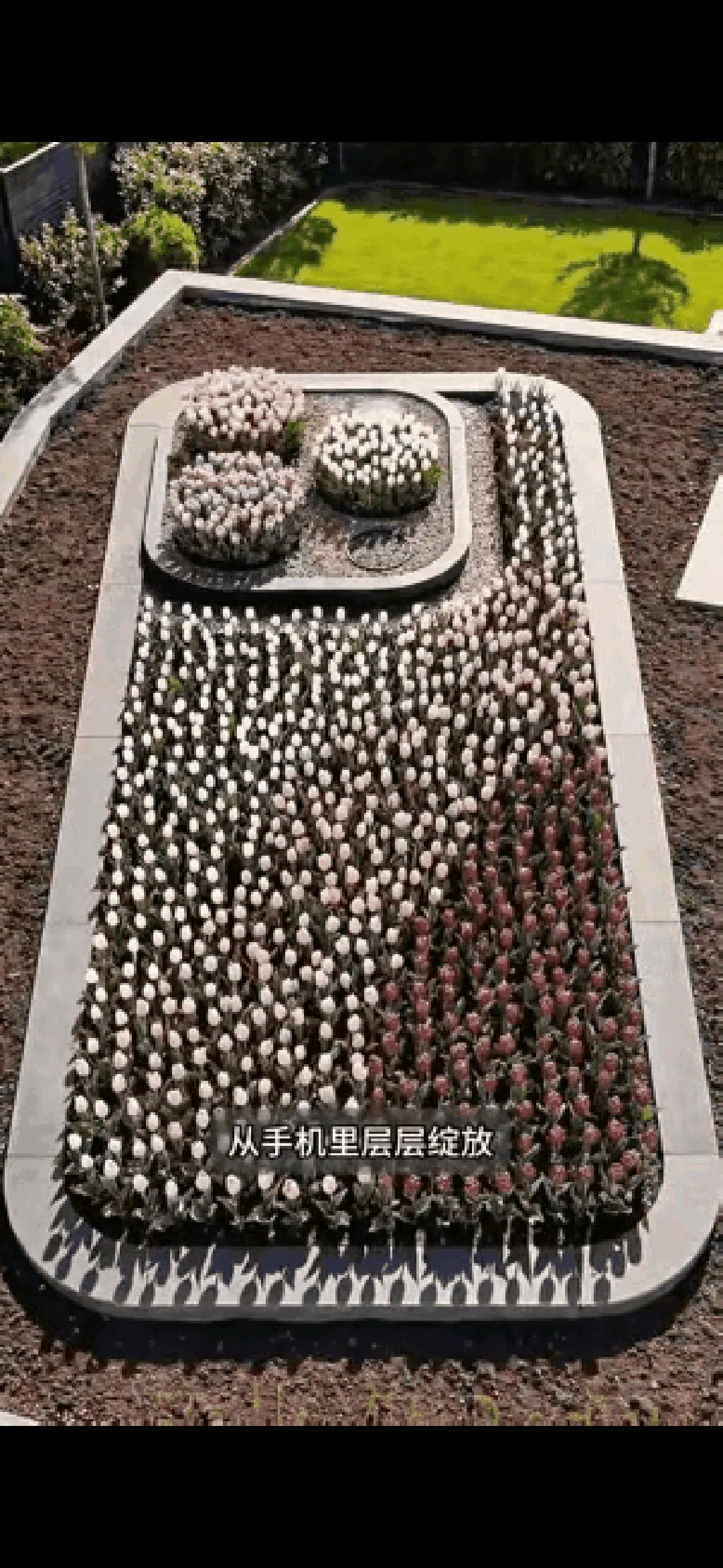 种花与种菜,反映的是观念差别和生活态度! 下列的图片反映的是国外的一名女士,在自己的家里打造一个花园的过程。 你看,她先用石材把自己花园里的一角制作成一部手机背面的样子。然后精心的放进去蛋托,把郁金香的根茎逐个放好,撒上营养土壤,浇水灌溉。不久,这里便是一个手机版图的郁金香花园(图六)。看到这,我就觉得好有生活品味,好有生活的品味。 看到这,我也知道,肯定有人说,这外国娘们,真不会过日子,这里该种上菜啊。 呵呵,这就是差别!不仅是外在的,更是内涵上的,是对美好生活的向往,更是对自己创造美好生活的态度。 不知道你是不是也这样认为呢?