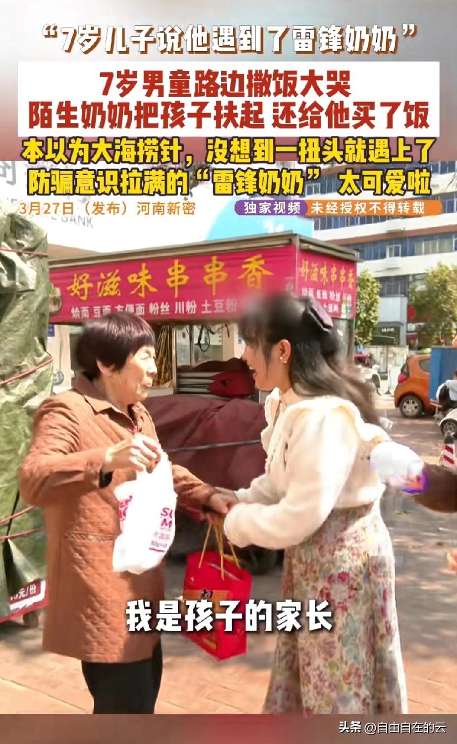 又暖又好笑。河南新密,一个男孩买饭的时候不小心摔倒了,饭都撒了,孩子就很难过。旁边一个奶奶看到了,说孩子别哭,我再给你买一份。 奶奶就用自己的钱给孩子又买了一份。 孩子等饭的时候,奶奶就走了。孩子回家和妈妈说他遇到一个雷锋奶奶,帮助了他,因为孩子刚学了雷锋这篇课文,就说奶奶是雷锋。 孩子妈妈觉得挺感动的,就想去感谢奶奶,可是她也不知道奶奶姓啥,叫啥,在哪里住,就求助记者帮忙。 记者和孩子妈妈在饭店周围找了一圈,也没人认识老人。就在他们失望之际,看到路边走路的一个老人特别像这个奶奶,记者就追上去,可是记者越追,奶奶就越跑。 奶奶跑的还挺快,记者就喊,“奶奶别走,我不是坏人,我是小莉帮忙的记者。”奶奶跑的更快了。 记者又喊,你昨天是不是帮一个孩子买了一份饭。奶奶这才停下来,孩子妈妈也赶紧过来,送上礼物,说非常感谢奶奶。奶奶说她看到孩子饭撒了,就给他买了一份,就是件小事。 有网友说,这个奶奶又聪明又善良,反诈能力还挺强的,看到陌生人追她,赶紧跑,奶奶太可爱了。 有网友说,奶奶是不是以为小莉帮忙来给调解的,吓得拔腿就跑。 奶奶心地善良,孩子妈妈知恩图报,都是好人,给他们点赞![赞][赞][赞]