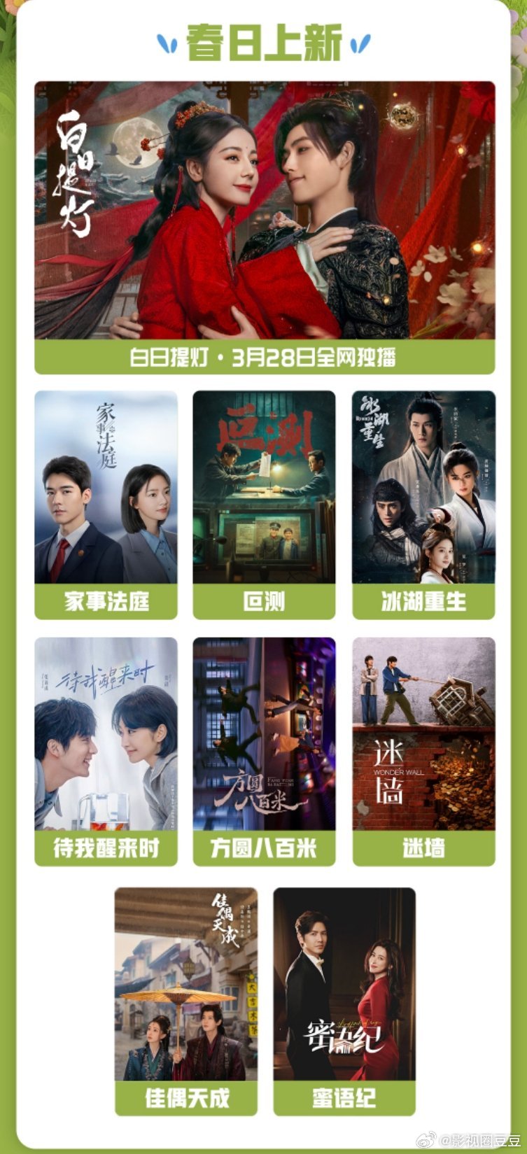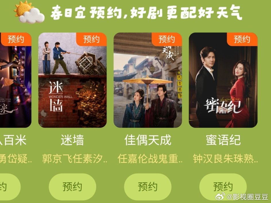 腾讯视频春日片单 鹅的四月待播剧《白日提灯》《家事法庭》《叵测》已定档播出四月上旬待定档的有:李昀锐《冰湖重生》景甜张新成《待我醒来时》四月中旬待定档的有:许凯《方圆八百米》郭京飞《迷墙》四月下旬待定档的有:任嘉伦《佳偶天成》钟汉良《蜜语纪》