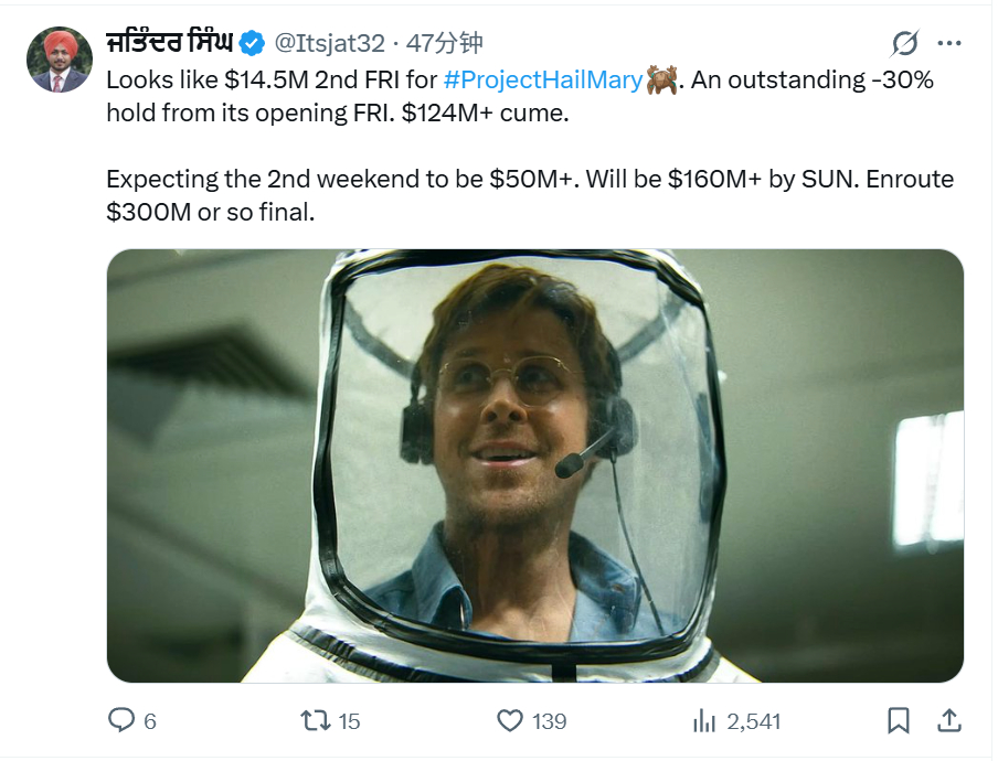 TNABO 《挽救计划》北美票房持续发力,这周末估计能砍5000万美元,比首周末(80.5M)下滑不到四成。目前势头完全不逊于这两年春季上映的《沙丘II》(最终282M)和《罪人们》(280M),若能抗住下周《马里奥2》的冲击本土冲三亿刀不是不能奢望。