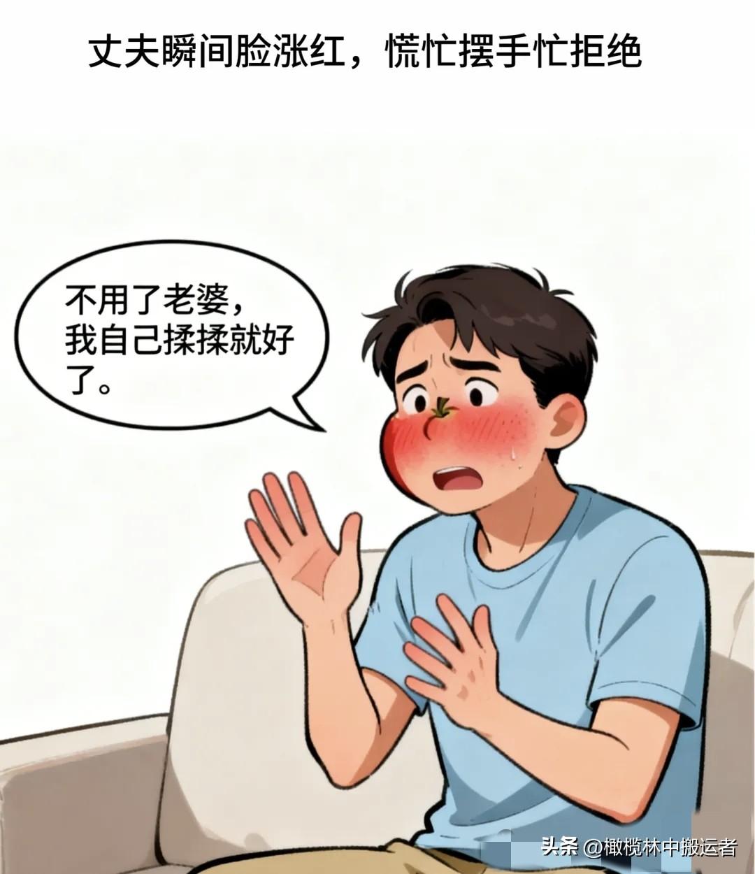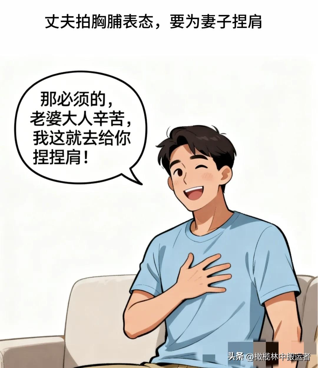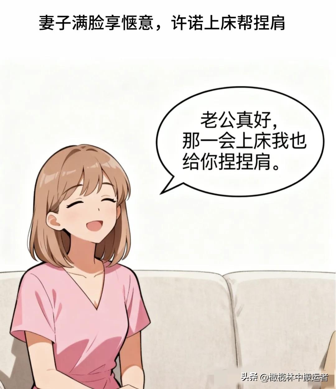 趣味漫画:老婆瘫坐沙发:加班累死,连热饭都没吃上。老公端汤:快喝,饭热三遍了。老婆:上床我给你捏肩。老公慌忙:不用,我自己揉。