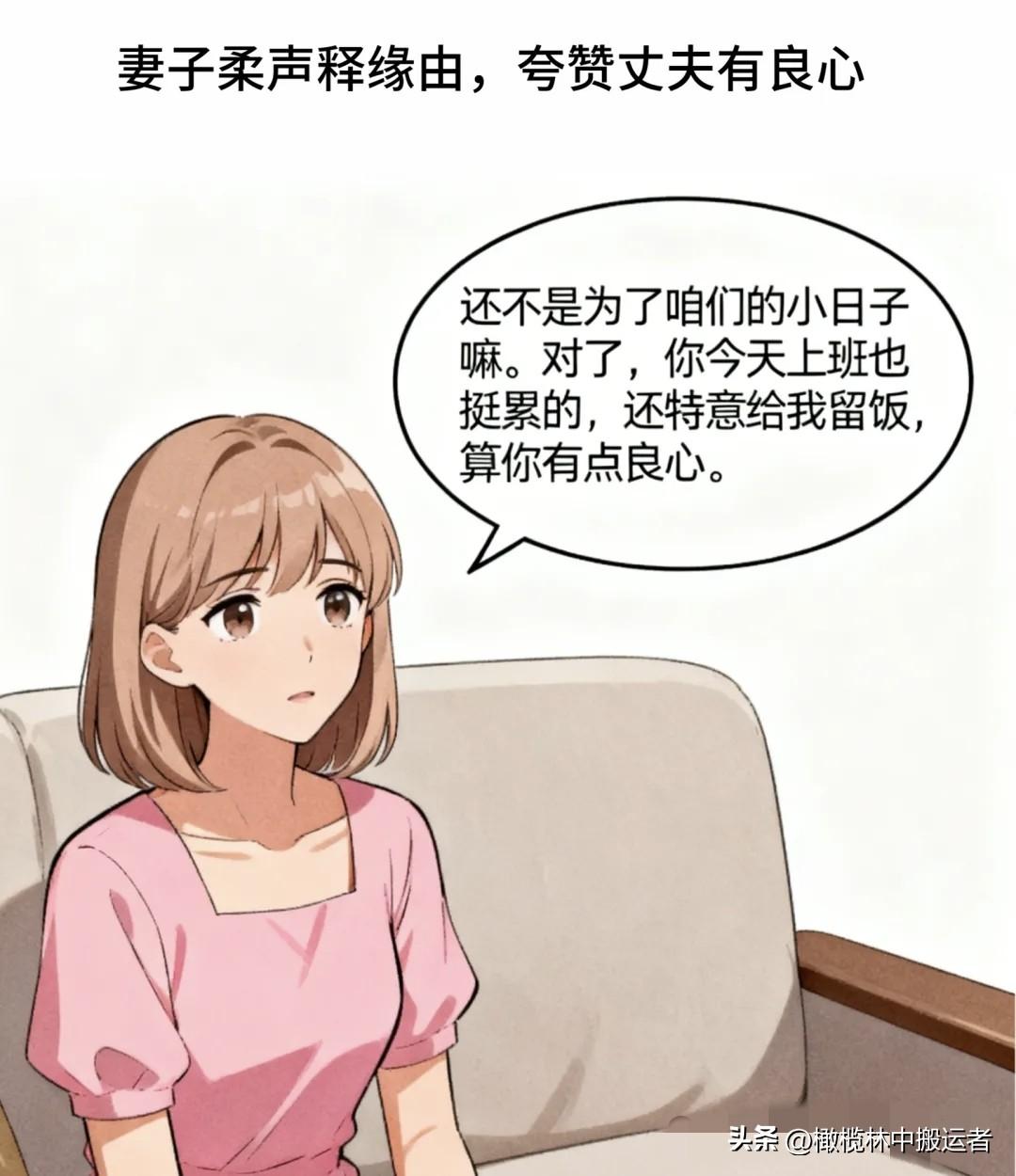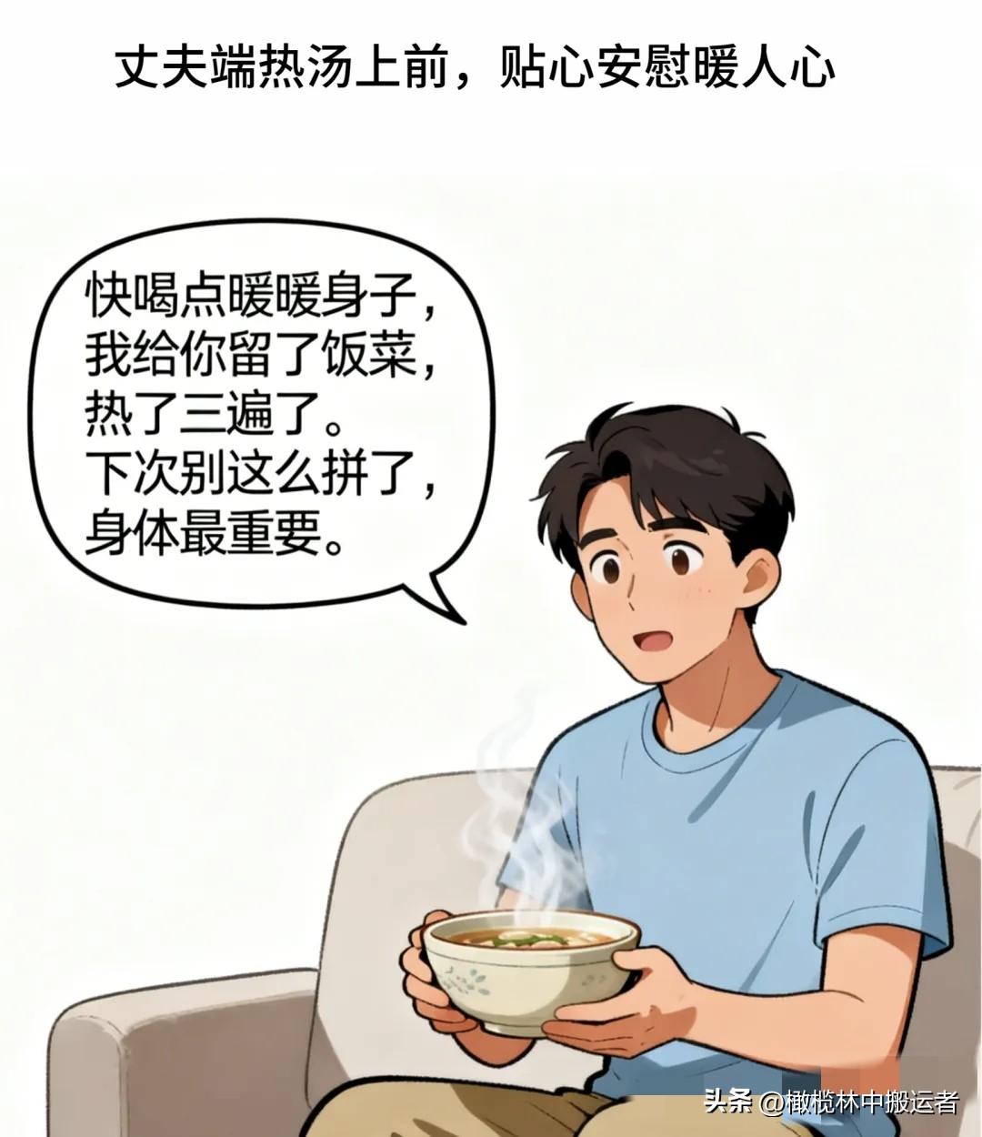 趣味漫画:老婆瘫坐沙发:加班累死,连热饭都没吃上。老公端汤:快喝,饭热三遍了。老