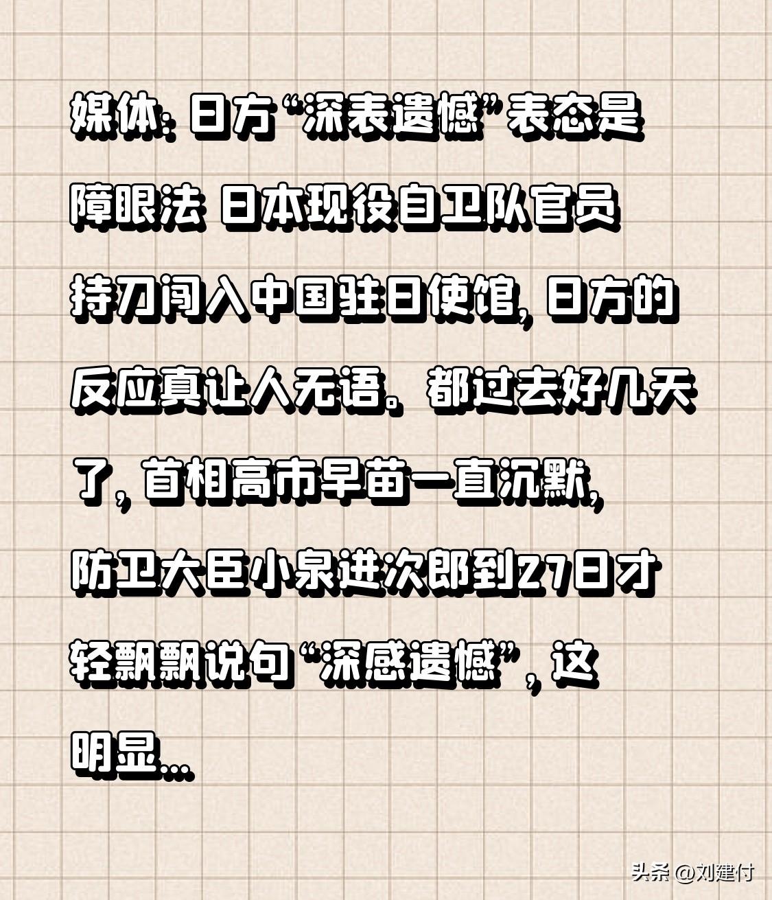媒体:日方“深表遗憾”表态是障眼法 日本现役自卫队官员持刀闯入中国驻日使馆,日方的反应真让人无语。都过去好几天了,首相高市早苗一直沉默,防卫大臣小泉进次郎到27日才轻飘飘说句“深感遗憾”,这明显是想避重就轻把事情“拖”过去。