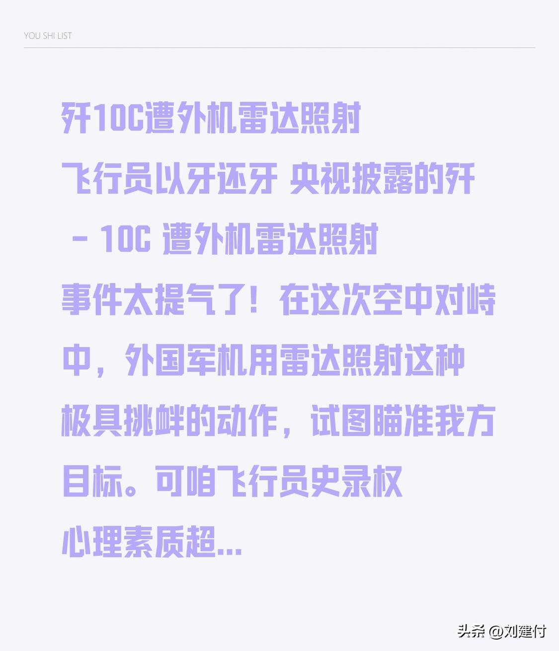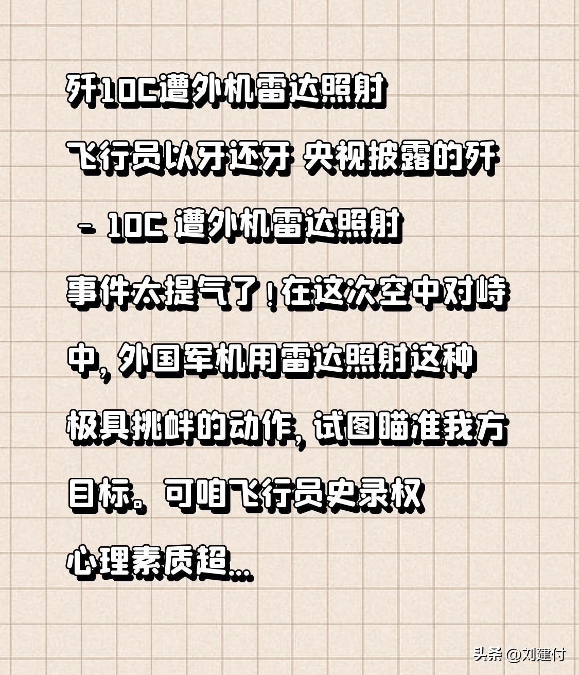 歼10C遭外机雷达照射 飞行员以牙还牙 歼10C遭外机雷达照射,飞行员以牙还牙。央视披露的歼 - 10C 遭外机雷达照射事件令人振奋!空中对峙时,外国军机用雷达照射这一极具挑衅性的动作,试图瞄准我方目标。