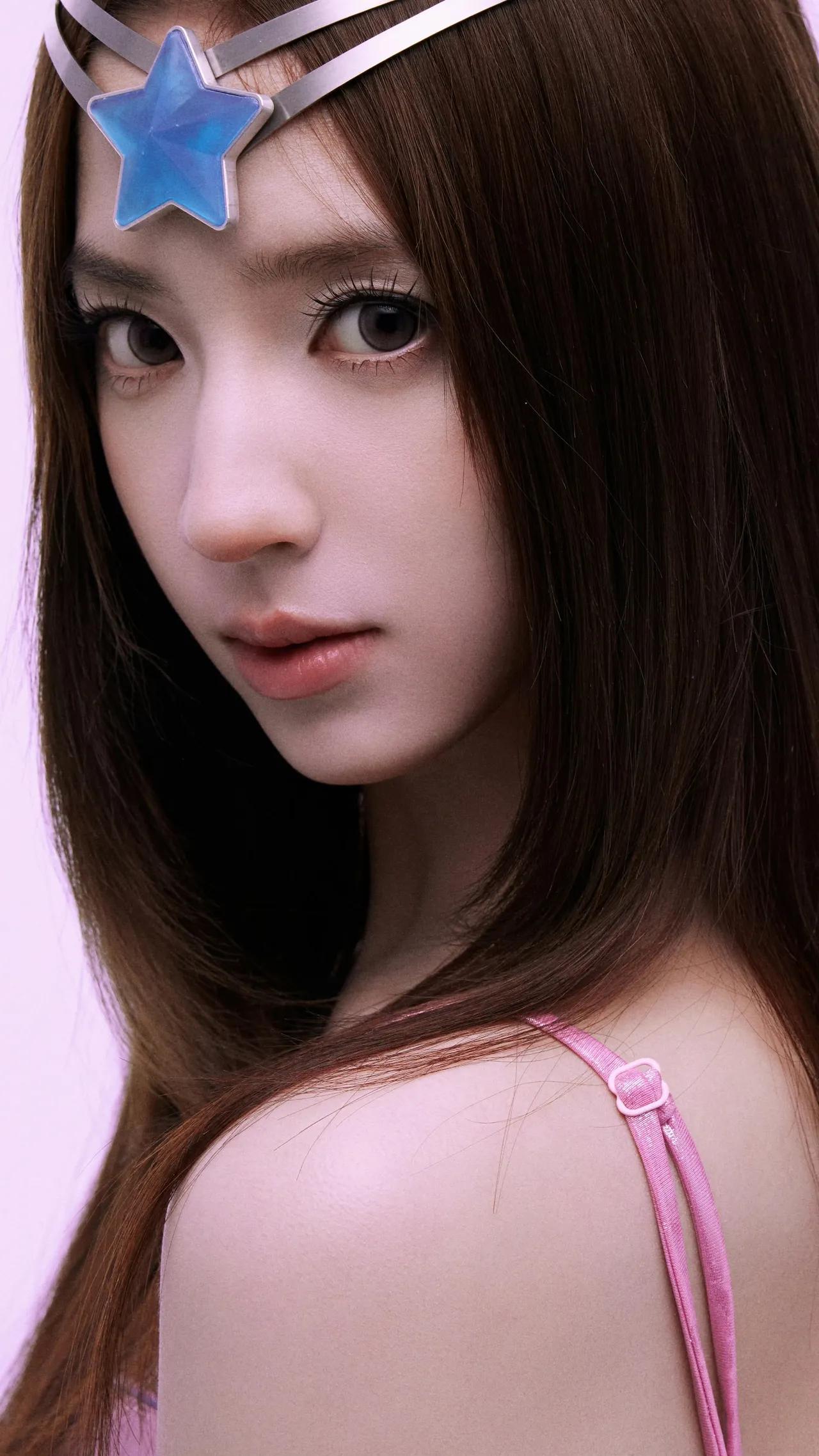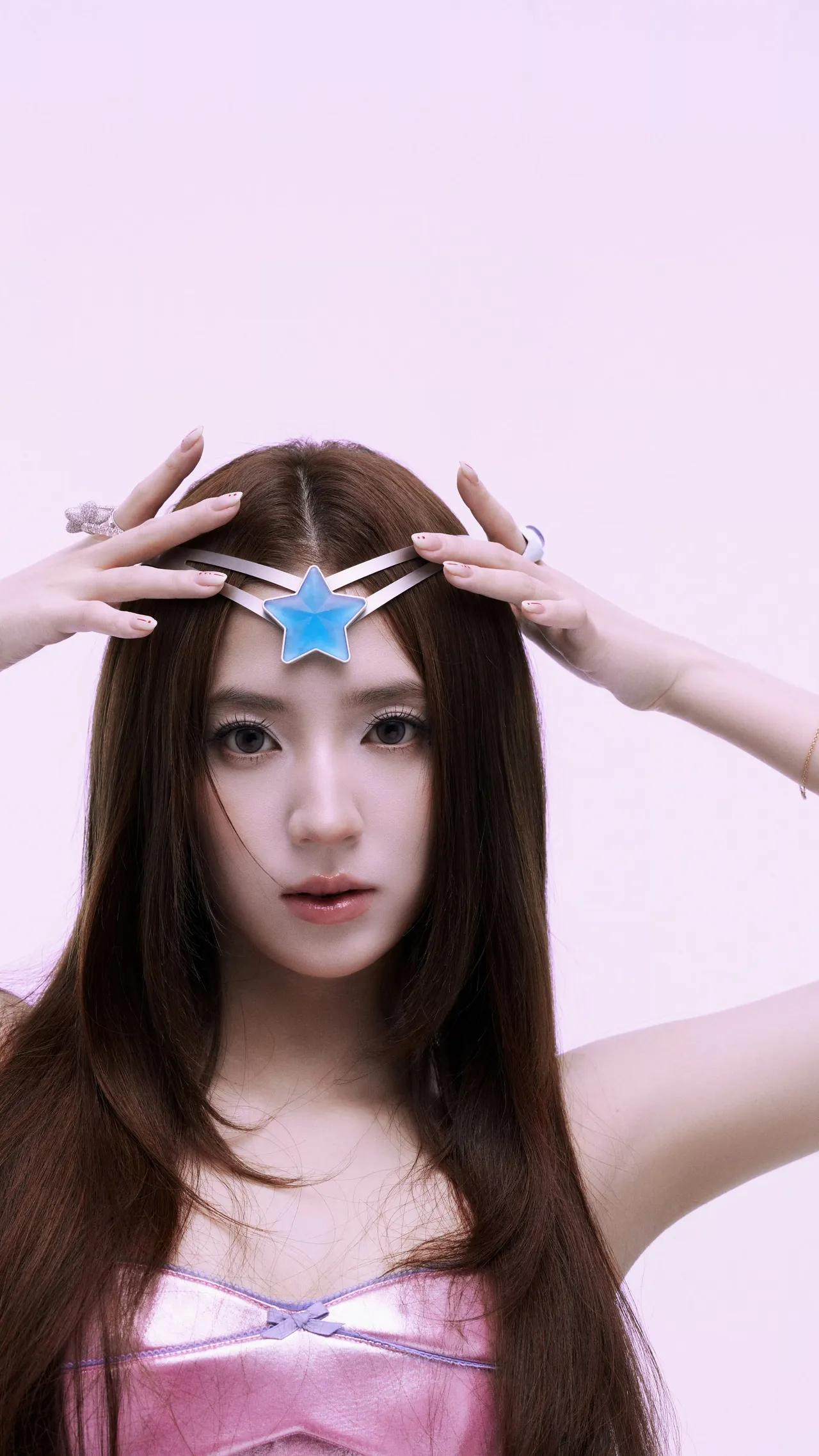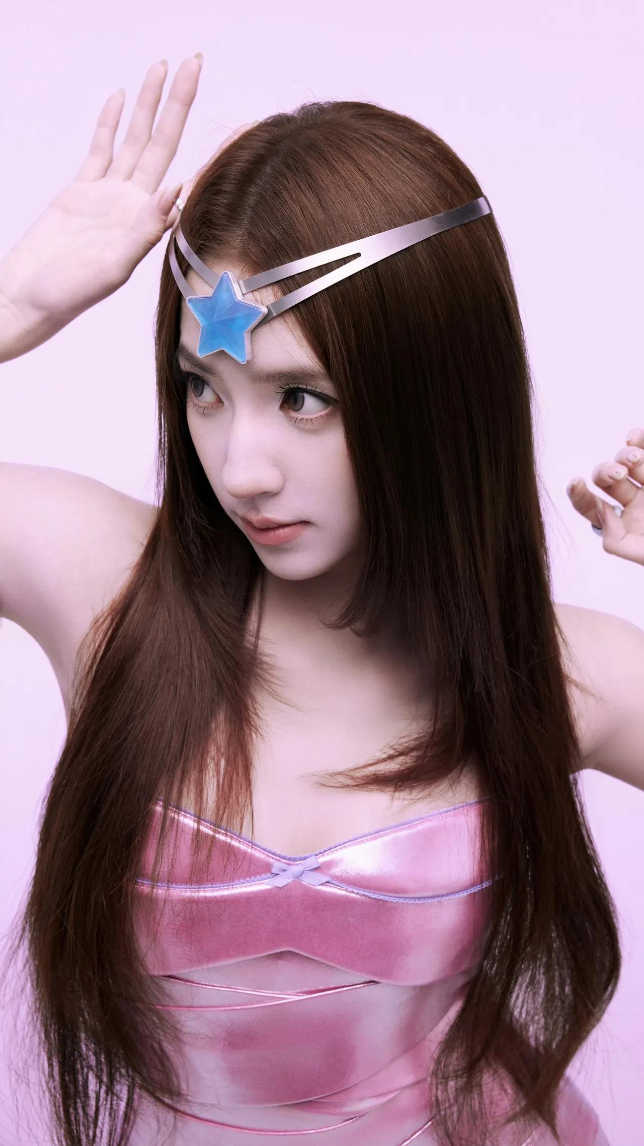 美女壁纸~粉雾色的背景里,星光发饰与金属光泽的裙装碰撞出甜酷感,长发垂落间,是少女的灵动与未来感的交织
