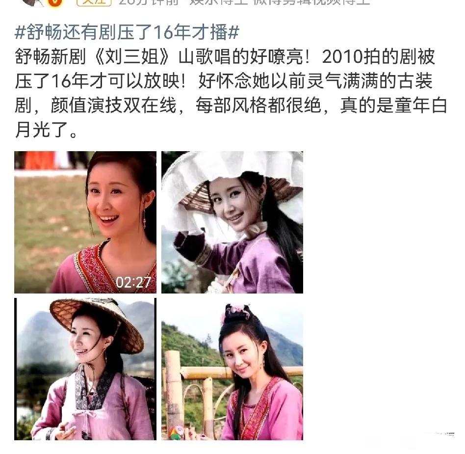 舒畅这瓜太虐了!23岁拍的剧压16年才播,黄金期全被耗没了 家人们谁懂啊!3月28号内娱静悄悄,舒畅突然冲上热搜,这瓜吃着全是心疼,太可惜了! 2010年,23岁的舒畅正红到发紫,《宝莲灯》小玉、《魔幻手机》傻妞,国民度拉满,妥妥央视最年轻女主。那时候她远赴柳州实景拍《刘三姐》,一身壮族服饰,站在山水间灵气爆棚,搭档刘冠翔演阿牛哥,剧组全员铆着劲要冲年度大戏。 结果呢?同年9月杀青,直接被压到现在,整整16年! 最近才悄咪咪在咪咕视频上线,连个宣发都没有,纯纯“裸播”,舒畅本人估计都是开播当天才知道。 为啥压这么久?全是行业现实的无奈 - 投资方直接破产,后期没钱做、宣发没人管 - 版权纠纷扯不清,制作方、平台、电视台互相扯皮,项目直接“冰封” - 审查、排播各种卡,古装剧饱和,这部直接被挤到片库角落吃灰 更虐的是,这还不是个例!《天下长安》《乾隆秘史》一部接一部压,她直接迎来7年无新剧播的空白期。从23岁灵气少女,等到39岁,黄金演艺期全被耗没了,最后只能转型直播带货,谁看了不叹一句意难平。 现在刷到剧里23岁的舒畅,脸上还有婴儿肥,山歌一唱元气满满,弹幕全是“爷青回”“等过了她的黄金时代”。16年啊,观众都从学生变爸妈,她从顶流小花熬到无戏可拍,这哪是压剧,简直是把一个演员的职业生涯给压没了。 内娱这种压剧魔咒真的太狠了,多少好演员、好作品就这么被埋没。只能说《刘三姐》能播已经是奇迹,舒畅这16年的等待,真的太让人心疼了! 舒畅 刘三姐 刘三姐剧压16年才播 咪咕