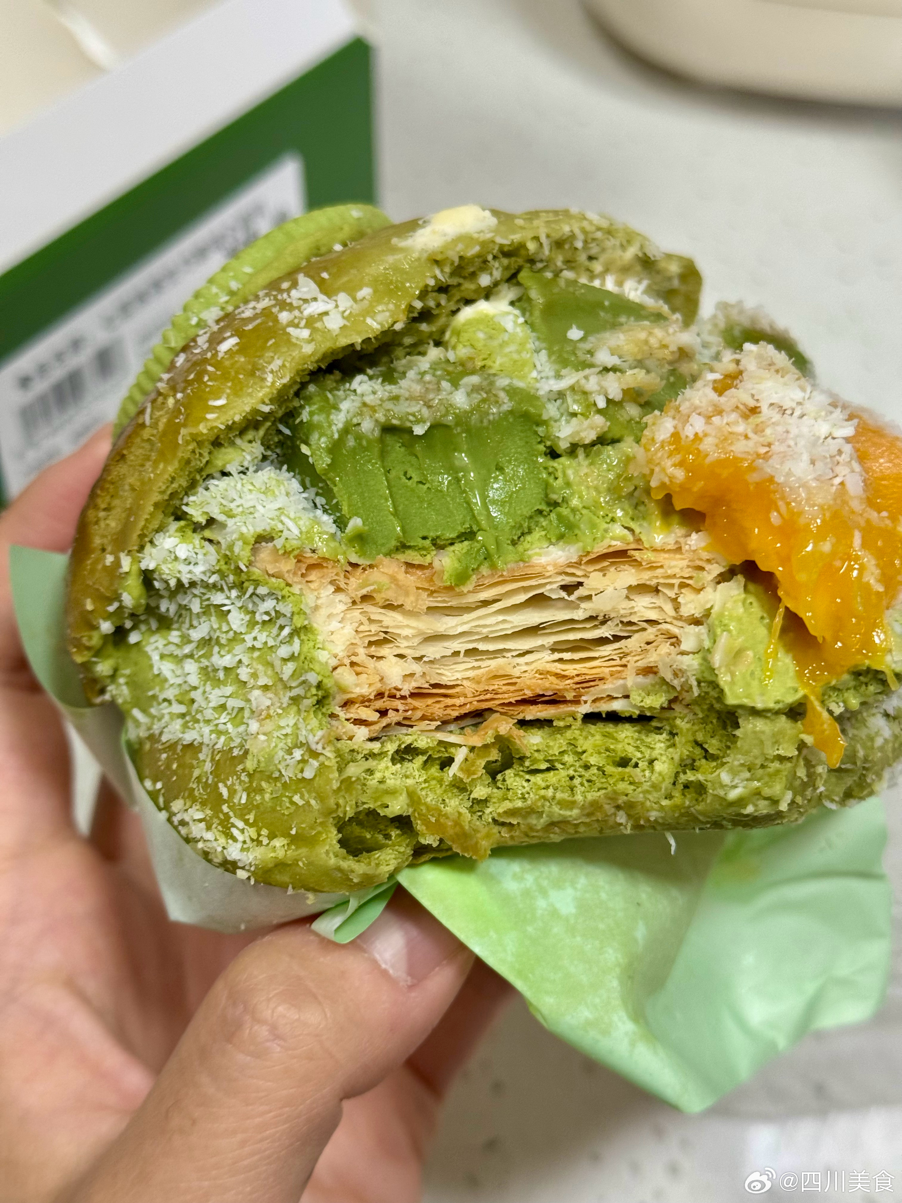 我该怎么描述你,我的抹茶生巧拿破仑面包……一口吃不下,最突出的就是抹茶生巧和上面的椰蓉,其它的好像没有太尝出味川川逛吃日常