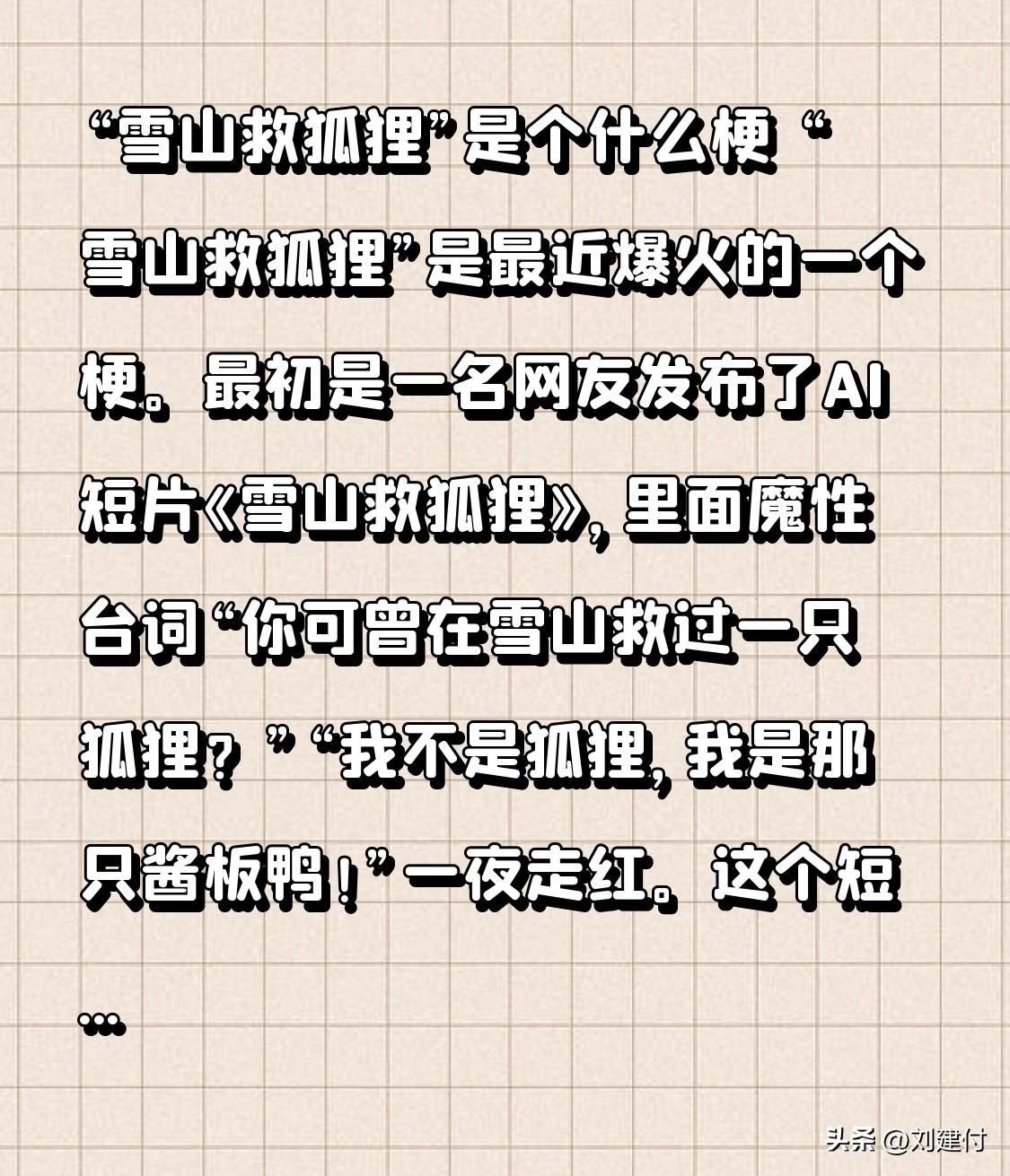“雪山救狐狸”是个什么梗 “雪山救狐狸”是什么梗?它是最近爆火的一个梗。最初,一名网友发布AI短片《雪山救狐狸》,其中魔性台词“你可曾在雪山救过一只狐狸?”“我不是狐狸,我是那只酱板鸭!”一夜走红。