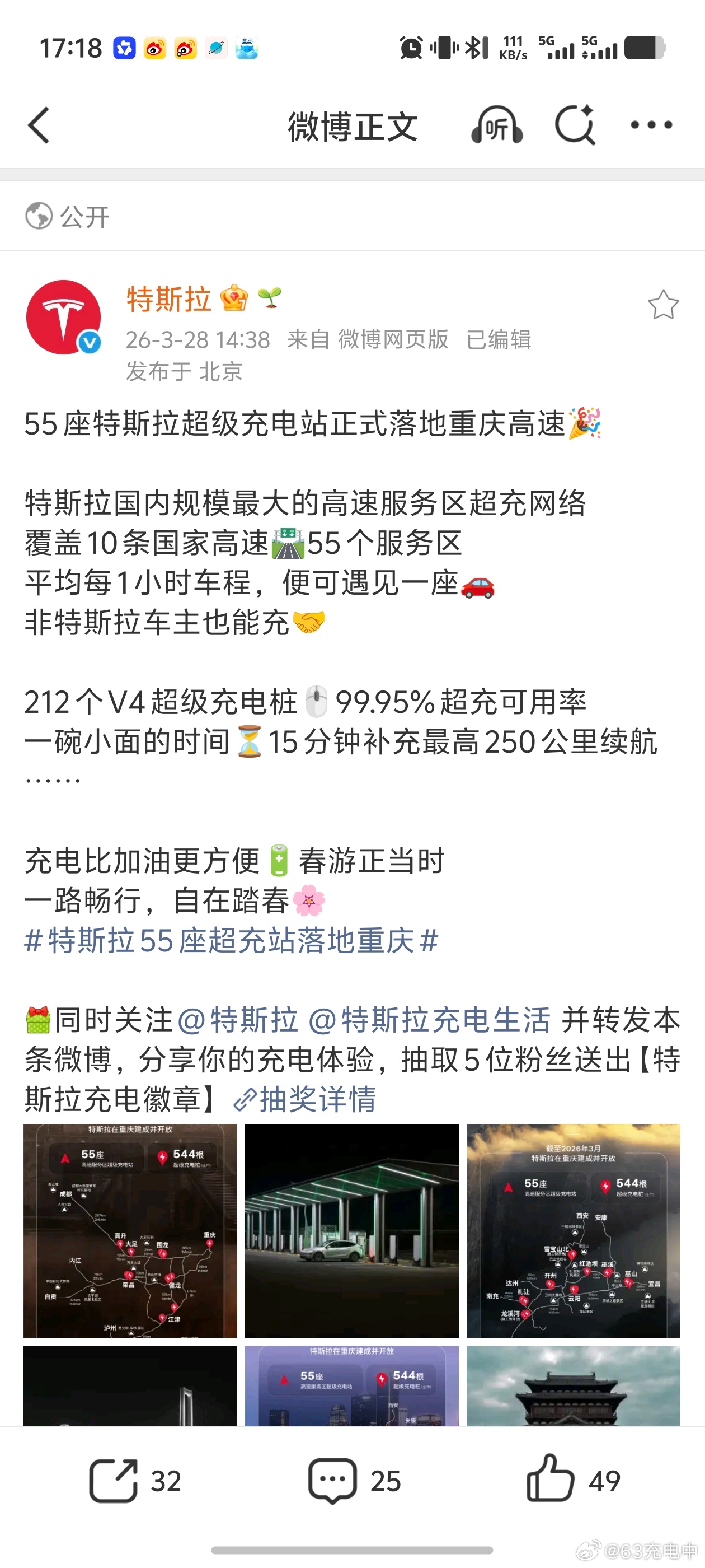 Wow!特斯拉也开始在高速上铺充电桩了,55 座特斯拉超级充电站落地重庆高速。