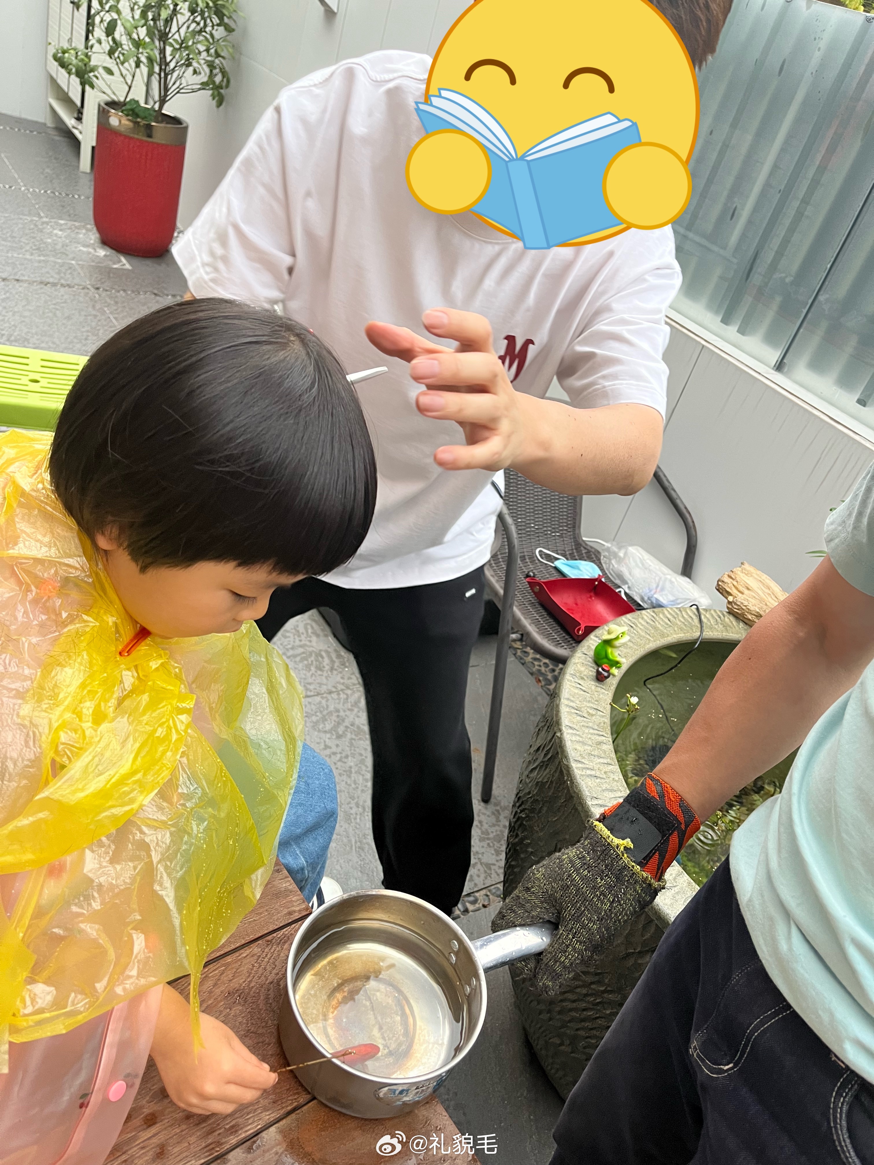 下雨了,球坚持要在院子里剪头于是压压爷爷撑起了雨伞球又说要钓鱼我大舅把鱼抓出来放在锅里给她钓着玩