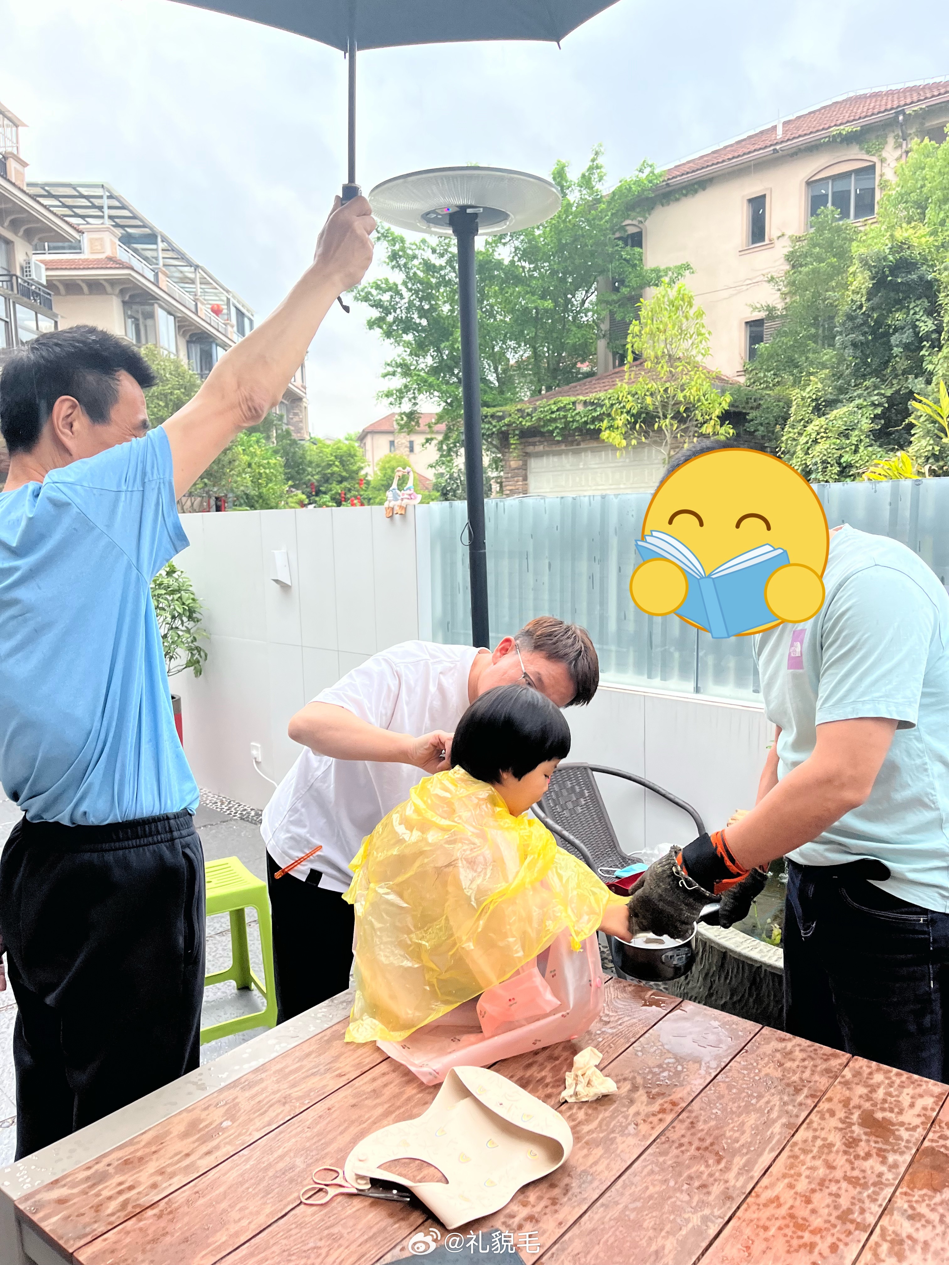下雨了,球坚持要在院子里剪头于是压压爷爷撑起了雨伞球又说要钓鱼我大舅把鱼抓出来放