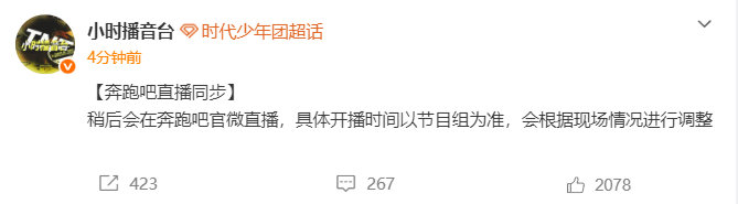 时代少年团奔跑吧有直播 时代少年团《奔跑吧》有直播 期待等下和小炸们还有跑男团见面呀,不知道节目直播将会分享什么呢?坐等开播啦
