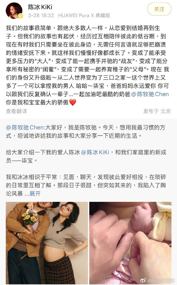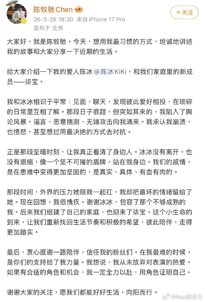 陈牧驰发长文回应与陈冰结婚生子并向大家介绍了家庭新成员还感谢了一路支持的粉丝