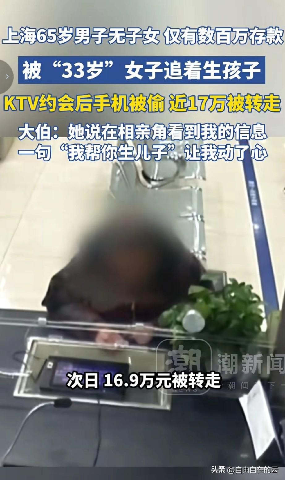 这大爷也太单纯了,有几百万的存款,还用的着去相亲角找老婆。 媒体报道,上海65岁大爷受到33岁年轻女子的强势表白,女子说在相亲角看到的大爷信息,想给大爷生儿子。 大爷虽然身家百万,可是身后无儿无女,女子的话正合他的心意。当女子约他到 KTV见面时,他就去了,两人见面后喝了不少酒。约会后大爷发现自己的手机被偷了,卡里的16.9万现金也被转走。 大爷这才知道被骗了,赶紧报警。大爷告诉帽子叔叔,自己还有300万的理财金最近就到期,如果追不回手机,他损失可就大了。 好在警方及时抓到了偷手机的女子,原来这名女子是个惯犯,平时就以坑蒙拐骗为生。女子也不是她说的只有33岁,她都53岁了。 要我说大爷你有三百多万,还找什么老伴啊,自己自由自在,也不缺钱花,老了找个养老院,多舒服啊。不然可要看好自己的钱袋子。 对于这件事,你怎么看呢?