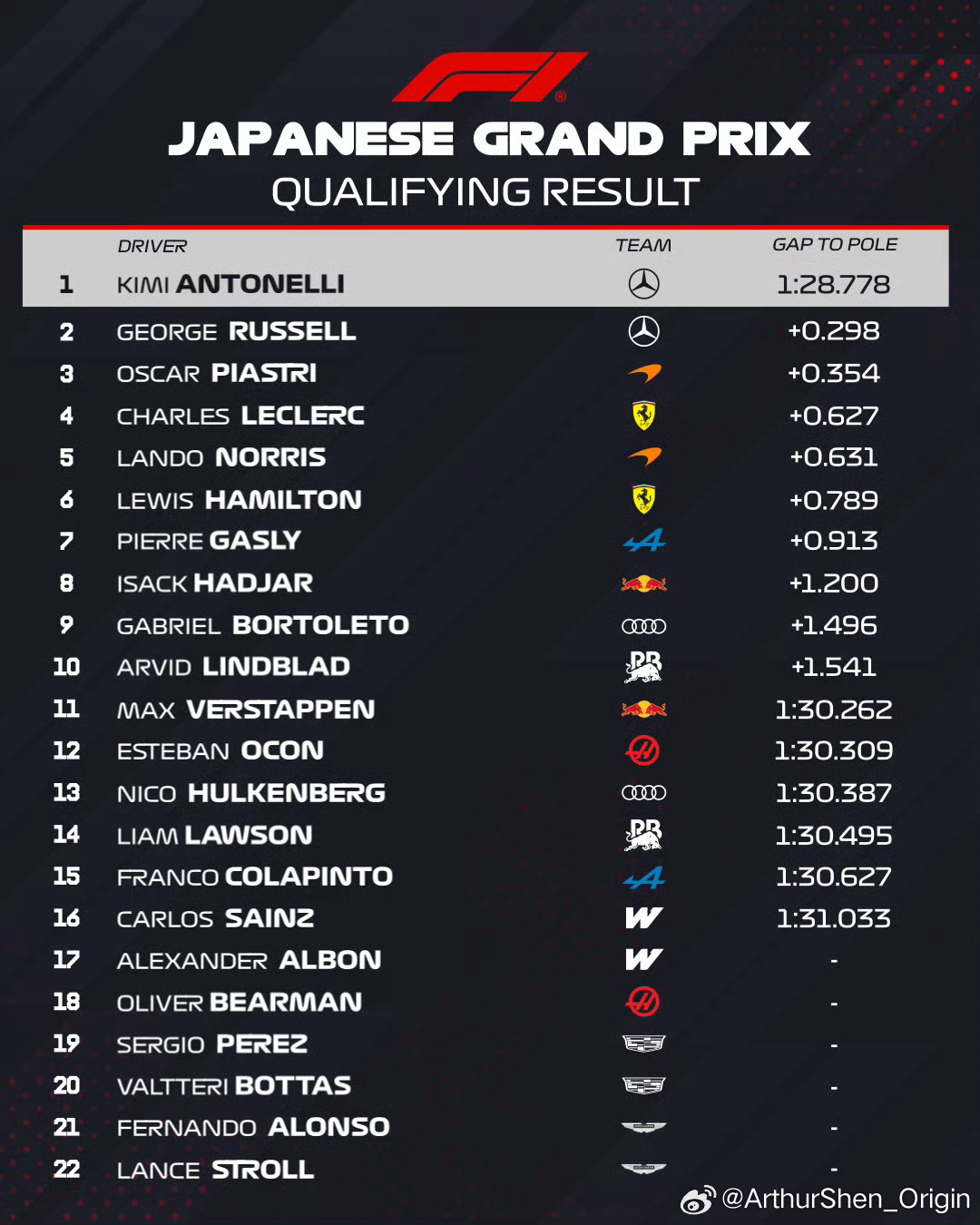 安东内利夺日本站杆位 恭喜安东内利再次取得杆位!拉塞尔P2,梅奔再度包揽前排!