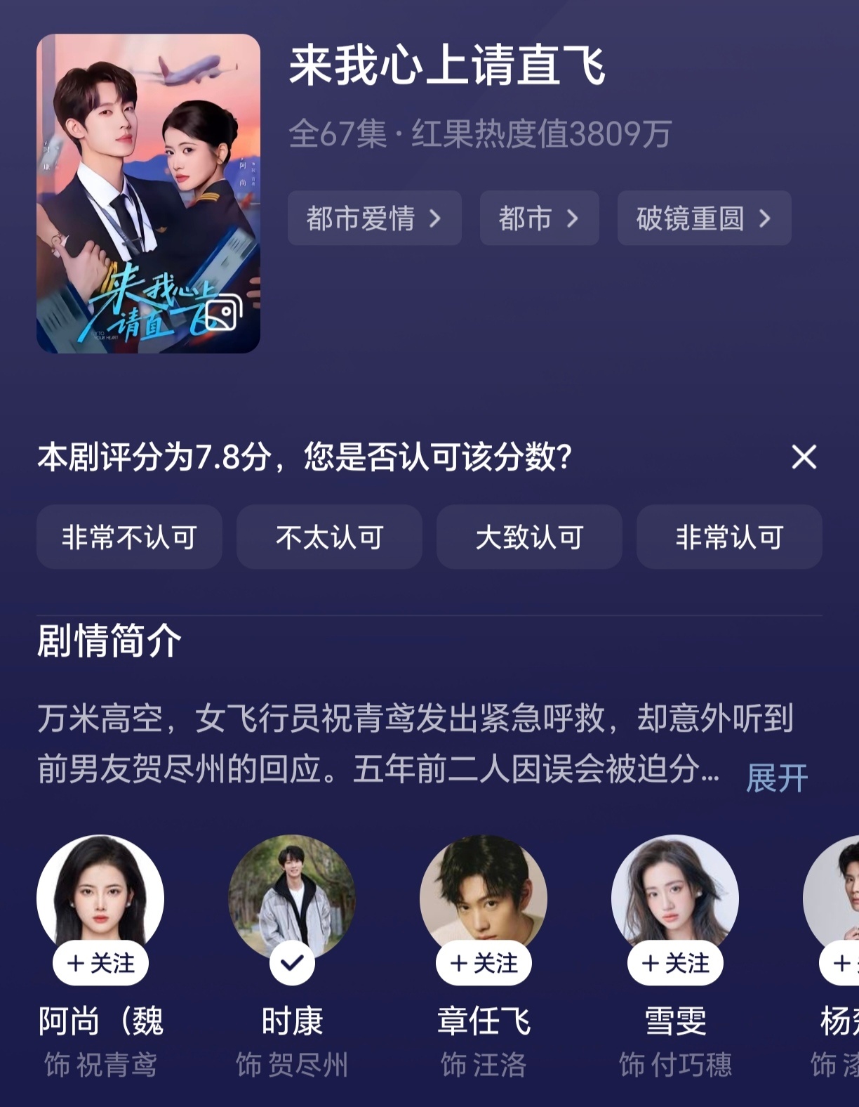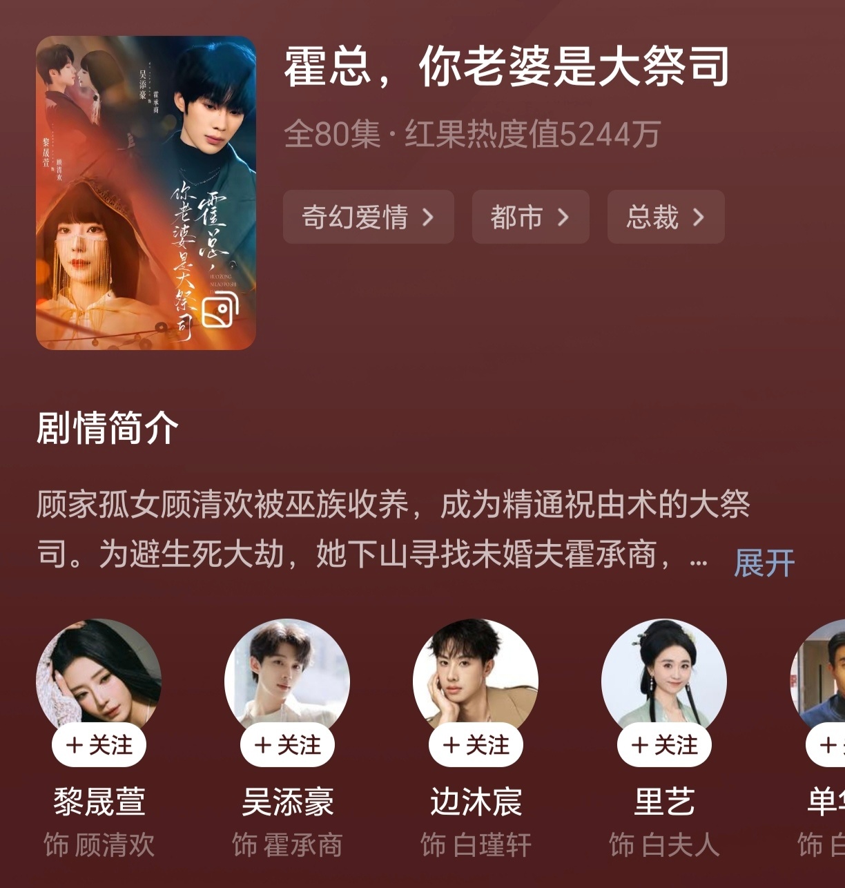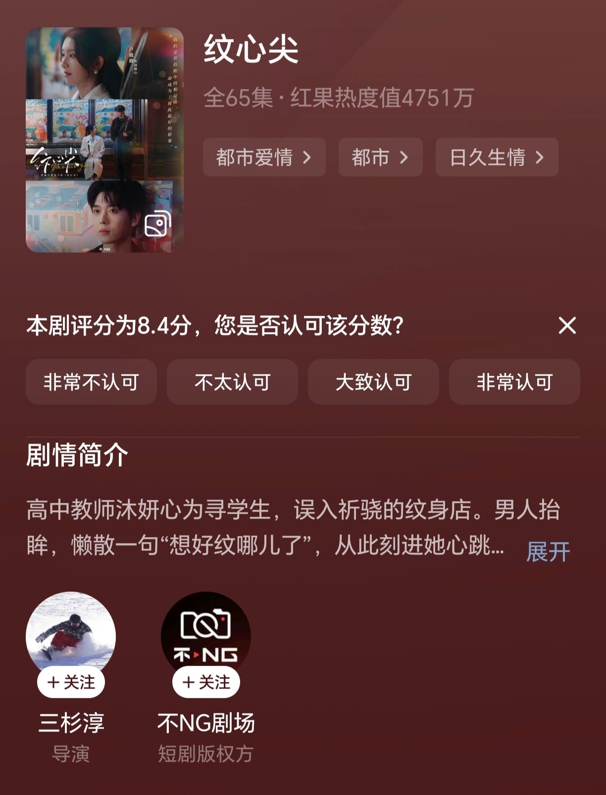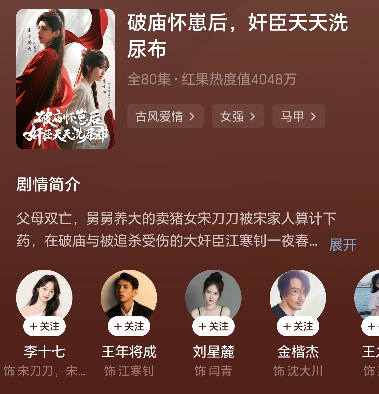 今日红果品鉴,全都不太好看《非正式试婚》没有cpf感,时康的发型看得头好痛,演技也看得头好痛,但比较好的地方是两个人相处有递进;《来我心上请直飞》剧情很平淡,优点是时康这里帅点;《纹心尖》卢鹿鹿好漂亮,卡戎也还可以,但剧情也是真的很平淡,细水长流但不能没有心跳加速;《破庙怀崽后,奸臣天天洗尿布》一个景拍完全部剧情,演技这种是完全没有的,但汉服博主穿汉服确实漂亮,以前认识李十七还是合作的博主,现在已经是短剧女主;《霍总,你老婆是大祭司》是我喜欢的玄学类型,但后面开始全是配角打嘴炮,来来回回两句话,对女主的刻画实在是太少了,吴添豪在这儿挂件得不能再挂件,一出现还妨碍女主干活儿,看得头好痛。