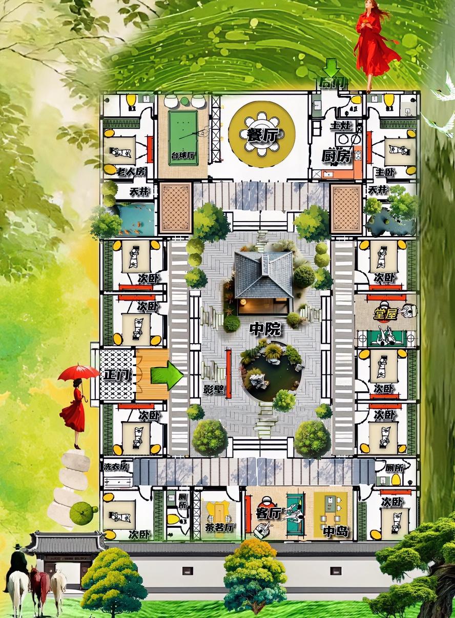 认清一个自建房最快的方式,看面相,也就是说看布局,565㎡合院,靠他的履历表,10间房,撑起了不豪华却接地气的派对游戏! 咋理解,布局不漂亮,格局很漂亮,没有一板一眼的老传统元素,都是怎么舒服就怎么搭配! 108㎡中庭是核心,立得住,比起简约版套房,是当之无愧的主心骨。 长影壁,圆水井,大亭子……像一个秀气南方私家花园,搭配俩个儿8㎡天井,简直就是又飒又酷的山水画! 我觉的,自建房没一进院装扮,很土气,相当于给合院解锁了灵气和韵味! 不信你瞧,十间房有八间屋,面积差不多格局相同,最乏味的小卧室,不考虑三同代堂,多余! 一个没情绪自建房,适合做民宿或者私人会所,收纳小,太阳少,厕所少,完全把老合院毛病,写在了脸上。 除去茗茶厅,台球厅和堂屋,西南角藏着一个4㎡洗衣房,最巧妙的布局,解决最棘手现代生话难题! 合院顿时就舒展了! 大门很敞亮,后门通菜地,如果不计较厨卫背靠背,土灶就是最好的自建房整容,饭香才是一亩地大院子,最暖心的安慰剂! 所谓生活顺了,人生就顺了,合院才有接气啊地气的品味! 合院布局不能太复杂,添加东西多了,自建房会打仗,抓不住生活重点,布局翻车还是养生,全靠动线妙,布局奇,才能出现10间房,这样的奇妙布局。 别让你的端景,出卖了你的生活圈! 祛魅后的后院,能住十大几口人,比奢美别墅,经得起左邻右居的三口不灿的嘴炮!