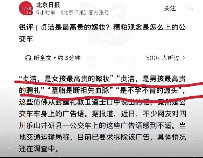 北京日报被骂了。起因是四川乐山的公交车上有一些标语,其中包括“贞洁是女孩最高贵的嫁妆”等。北京日报发文批判这是封建糟粕,结果引发了众怒。目前北京日报已经删帖。 女性保持贞洁就是洁身自好,这有什么不对?洁身自好的女性,古今中外都是道德的模范,现代社会更是最高贵的,更让人珍惜。洁身自好相对的是自甘堕落,相信没人不喜欢洁身自好的女性吧。 在洁身自好与自甘堕落之间没有模糊空间。媒体反对女性洁身自好,那就是支持自甘堕落呗,这种媒体的价值观令人汗颜。这种德行的媒体,还是少给别人扣帽子吧。