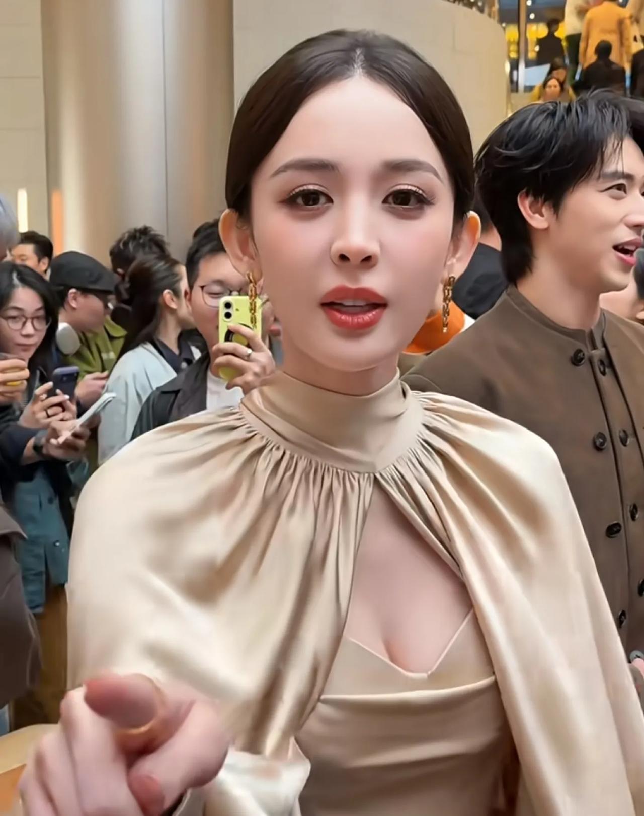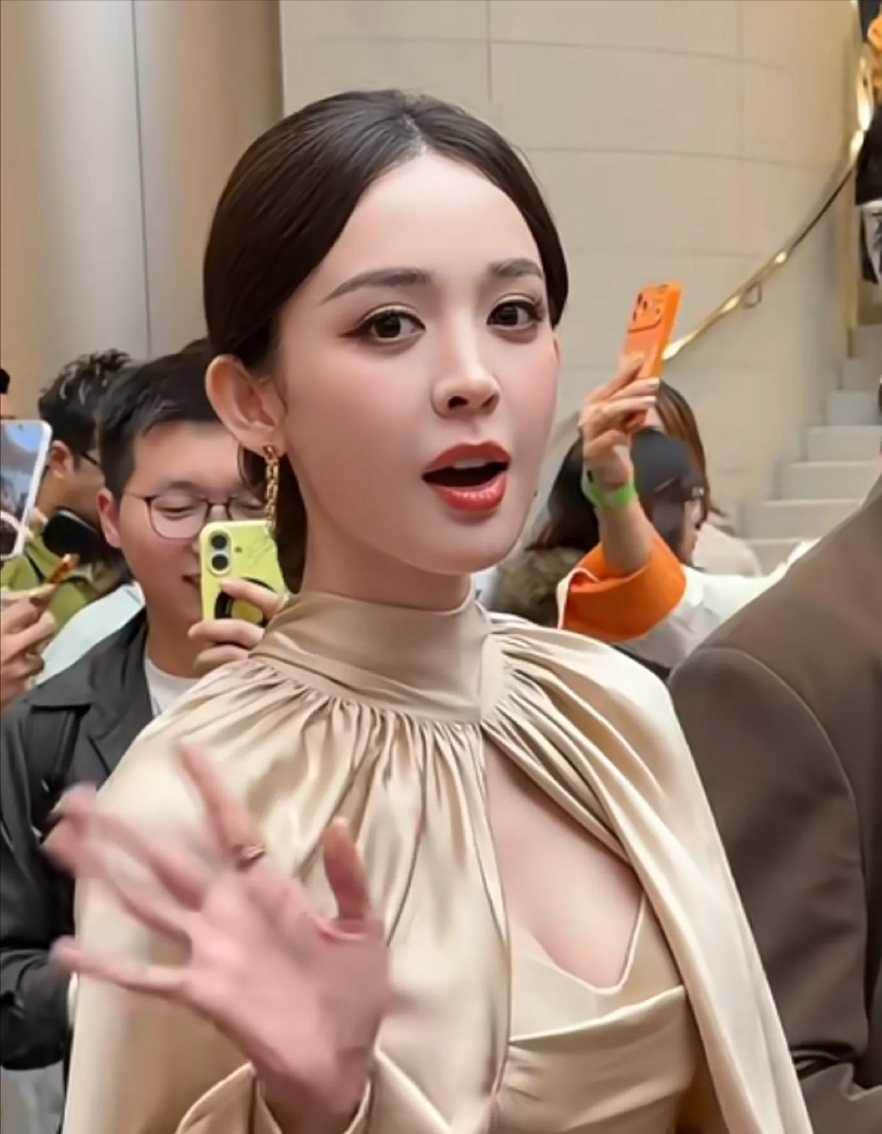 古力娜扎这是什么神仙颜值!香槟色缎面斗篷裙直接美到失语✨ 高领+镂空设计把优雅和性感平衡得刚刚好,缎面材质衬得整个人温柔又贵气,生图状态能打满分,站在人群里就是发光的存在! 古力娜扎 明星生图 高级感穿搭