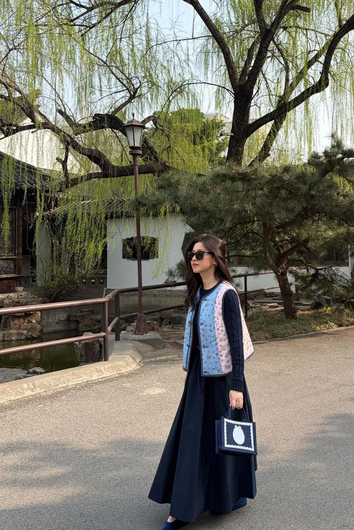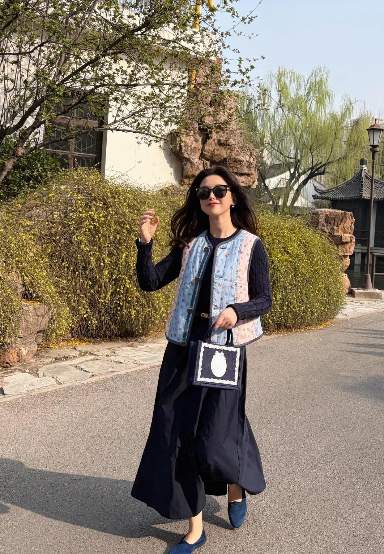 朱珠的穿搭品味真的绝了!藏蓝长裙+碎花马甲,复古又温柔,瞬间年轻10岁💥 马甲