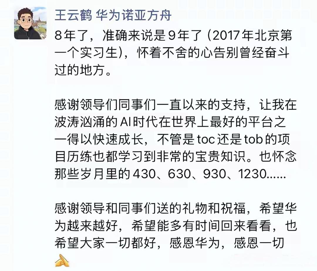 余承东接管华为Al业务半年后,终于开始Al这块的人事调整了。华为诺亚方舟实验室主任、盘古大模型负责人王云鹤在朋友圈宣布从华为离职了,结束他在华为近9年的职业生涯。这也是余总接管AI后,首位公开宣布离职的Al业务高管。 王云鹤在离职感言中,感恩华为这个平台让他在AI时代得到快速成长,并表示怀念作为一个有9年高强度工作节奏工作经历的华为人对季度末、半年末、三季度末、年末的绩效考核节点的职场记忆。 王云鹤2017年以实习生身份加入华为,2025年3月接任诺亚方舟实验室主任后,全面掌管盘古大模型的研发与开源工作,是该项目的第一责任人。在华为开源盘古Pro MoE模型被质疑“套壳”阿里通义千问(Qwen)事件中,王云鹤正是项目掌舵者,也是直接的管理责任人,争议发生在他任内。他的离职也被部分舆论解读为对该事件的间接回应,但华为从未将离职与争议直接挂钩。 不过,这应该是意味着华为AI战略在余承东领导下正经历深度调整期。余承东是 2025年9月29日被正式任命为华为IRB主任、全面接管AI战略的,到今天 2026年3月28日正好 6 个月。余承东接管后,华为AI从技术探索向商业化落地倾斜,更强调与终端、汽车、云业务的协同,而非纯学术研究。余承东的强势风格与终端思维,和原诺亚实验室的学术导向文化存在碰撞很正常,有人不适应而离开也很正常。 王云鹤没有在离职感言中透露他的下一步去向,但据多家科技媒体报道,他将投身Agent领域创业,并已启动融资。 聚是一团火,散是满天星。这是华为企业文化的精髓,相信华为的研发力量不会因为谁的离开而削弱,毕竟,国内的科研平台中,华为的行业地位就摆在那里,永远不会缺少向往者。余承东带领的华为AI团队,也仍将在商业化赛道上全力冲刺,余总团队永远不会甘居人后。华为 余承东 华为AI革新 AI余承东