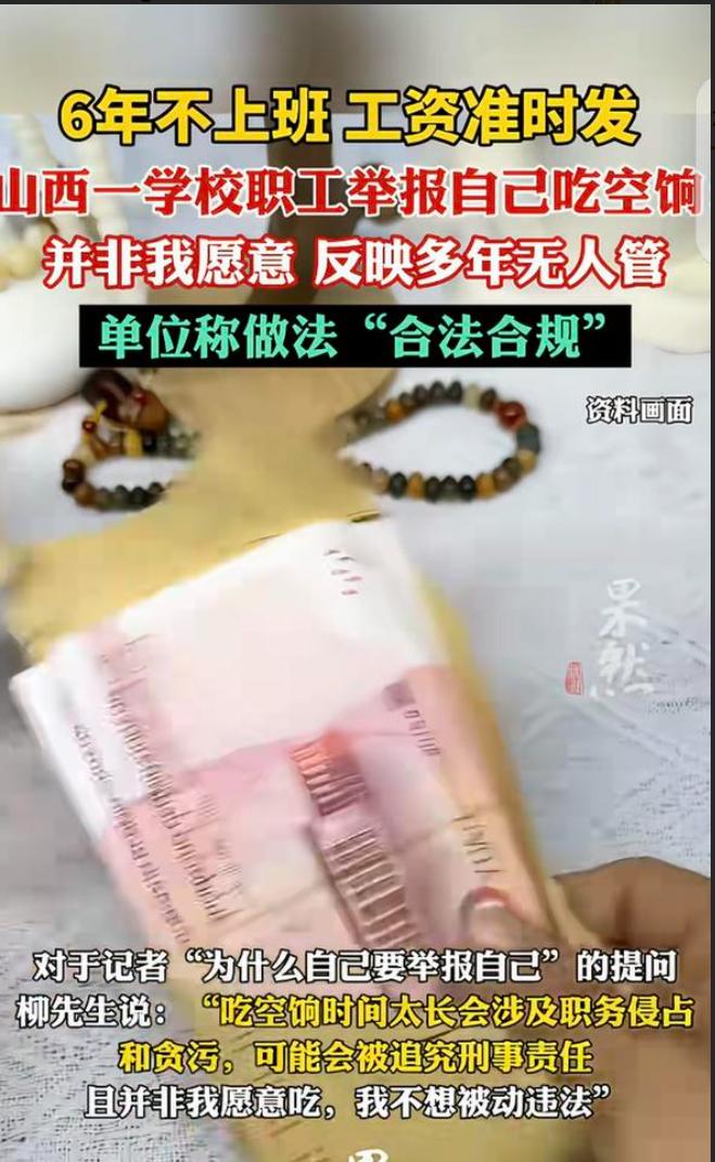“大义灭己!”山西太原,一男子6年没上班,每月8415元工资却准时发,他怕被追究责任,一狠心举报自己吃6年空饷,原来,男子工作调动,但他发现《调动登记表》既没盖章,审批程序也不对,而且,他技术人员10级被写成了科员9级。男子上了1个月就坚决不上了,要求调回原单位,可没人搭理他。他反映了6年,没人查没人管。单位回应:做法合理合规。 山西太原一男子原本在当地一家事业单位工作,是一名技术人员,职级为技术人员10级,工作稳定,收入也十分可观,原本以为会一直这样安稳工作下去,可一场突如其来的工作调动,彻底打乱了他的生活。 6年前,单位通知男子,要将他调动到另一个相关单位工作,男子虽有不舍,但也只能服从安排,按照要求填写了《调动登记表》,随后便前往新单位报到。 可到了新单位,刚上了1个月班,男子就发现了不对劲,仔细核对自己的调动手续后,更是满心疑惑和不满。 他发现,自己的《调动登记表》上,既没有加盖相关单位的公章,各项审批程序也十分不规范,明显不符合正常的调动流程。 更让他无法接受的是,自己原本的技术人员10级职级,竟然被错误地写成了科员9级,职级下调不说,相关的薪资待遇也受到了影响,这让他十分气愤。 可让他没想到的是,当他主动提出调回原单位的要求后,无论是原单位还是新单位,都没人搭理他,相关负责人要么敷衍搪塞,要么互相推诿,没人愿意出面解决他的调动问题。 男子没有放弃,接下来的6年时间里,他反复向原单位、新单位以及相关主管部门反映情况,提交材料,诉说自己的诉求,可始终石沉大海,没人查、没人管,事情一直没有任何进展。 这6年里,男子始终没有去任何单位上班,每天在家等待消息,可让他意外的是,每月的工资却从未间断,每月8415元,准时打到他的银行账户上,一分都不少。一开始,他还心存侥幸,觉得既然单位不解决问题,工资也照发,那就先这样拖着,可时间一长,他心里的不安越来越强烈。 他查阅了相关法律法规,得知吃空饷属于违规行为,情节严重的还可能涉及职务侵占和贪污,哪怕不是自己主动索要,长期不上班却领取工资,也需要承担相应的法律责任。 随着时间推移,他的心理压力越来越大,生怕这件事哪天被曝光,自己会被追究责任,思来想去,他最终下定决心,主动举报自己,彻底了断这件事。 男子递交举报材料后,相关部门迅速介入核查,核实了他6年未上班、每月领取8415元工资的事实,也确认了他的《调动登记表》确实存在未盖章、审批程序不合规,以及职级填写错误的问题。 就在大家以为单位会承认失误、妥善处理时,涉事单位却给出了让人意外的回应,称自身的做法合理合规,不存在违规调动和发放空饷的问题。 男子的调动事宜发生在2019年底,当时他从原单位被调入另一相关单位,调动后因对手续和职级不满,自2020年5月起便自主离校,不再上班,却一直正常领取工资。 6年来,他不仅多次向相关部门反映情况,还曾将人社、主管部门诉至法院,可始终没有得到满意的答复,最终才选择举报自己。 根据我国相关规定,事业单位工作人员调动需履行完整的审批程序,加盖相关单位公章,职级认定也需严格按照个人岗位和资质核定,严禁违规调动、职级错填等情况; 而吃空饷更是明确的违规行为,相关责任人需承担相应责任。近期,太原相关部门已成立由多部门组成的联合调查组,对该事件展开全面深入调查,后续将依法依规处理,并及时公布调查结果。 男子表示,自己举报自己,不是一时冲动,而是实在不想再被动违法,也不想一直被这件事困扰,哪怕最后会受到相应处理,也希望能彻底解决调动和职级的问题,还自己一个公道。他坦言,这6年里,自己每天都活在焦虑中,生怕东窗事发,如今主动举报,反而松了一口气。 对此,你们有什么看法,欢迎评论留言~