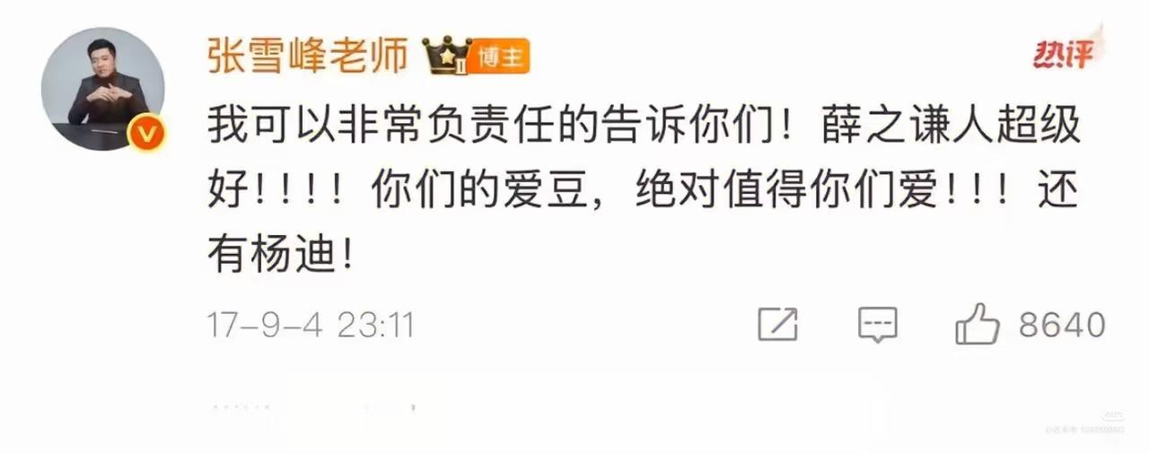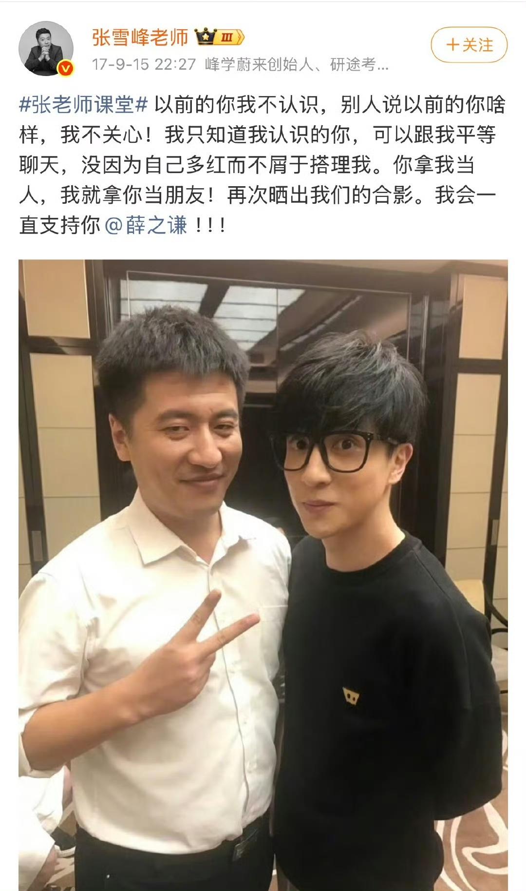 薛之谦还是发文悼念张雪峰老师了。 因为有演出工作,所以没能去到现场送他最后一程,“心有不甘 沉痛哀悼” 他算是内娱第二个发文悼念张雪峰老师的,第一个是刘维。 张雪峰巅峰期,上过不少综艺,也跟不少明星合作过,比如杨迪,沈梦辰,赵露思,刘维等。 但是他离开后,只有刘维和薛之谦发文悼念了,合作挺多次的杨迪却没任何表示,而且还很开心的宣传自己的综艺。 当然,这个事情我们不能道德绑架,但是通过这件事也能看出,为什么薛之谦有那么多朋友力挺他了。 张雪峰17年这篇微博就是最好的解释!
