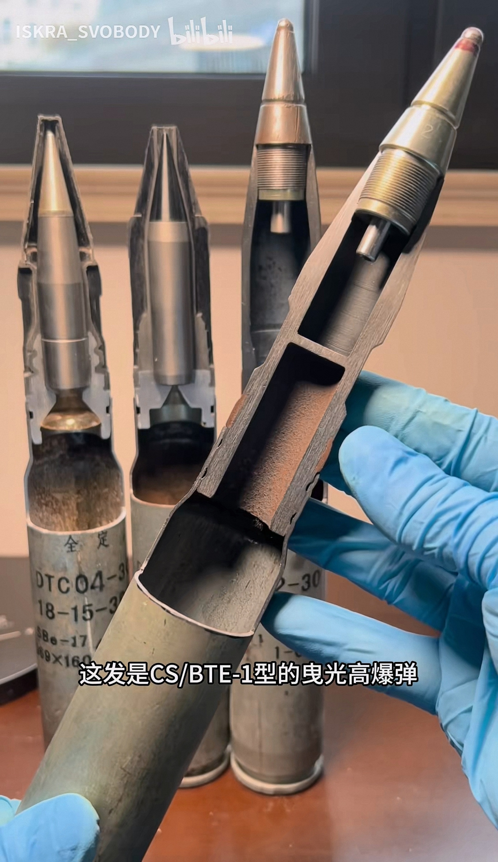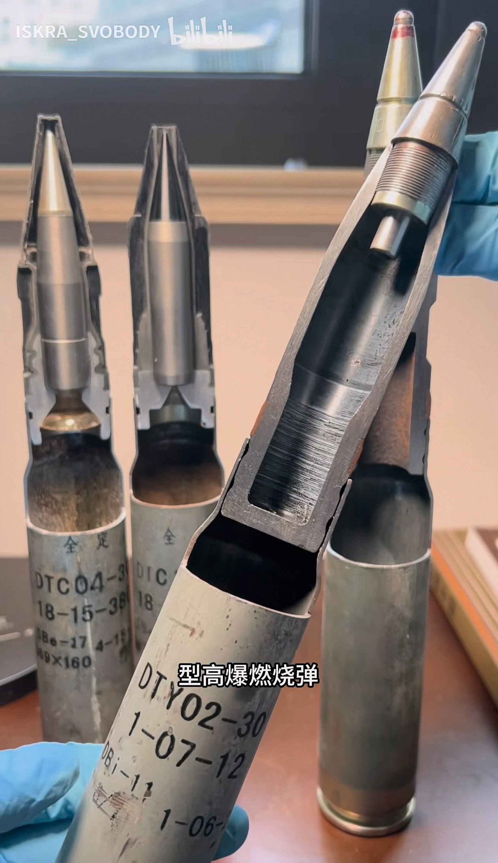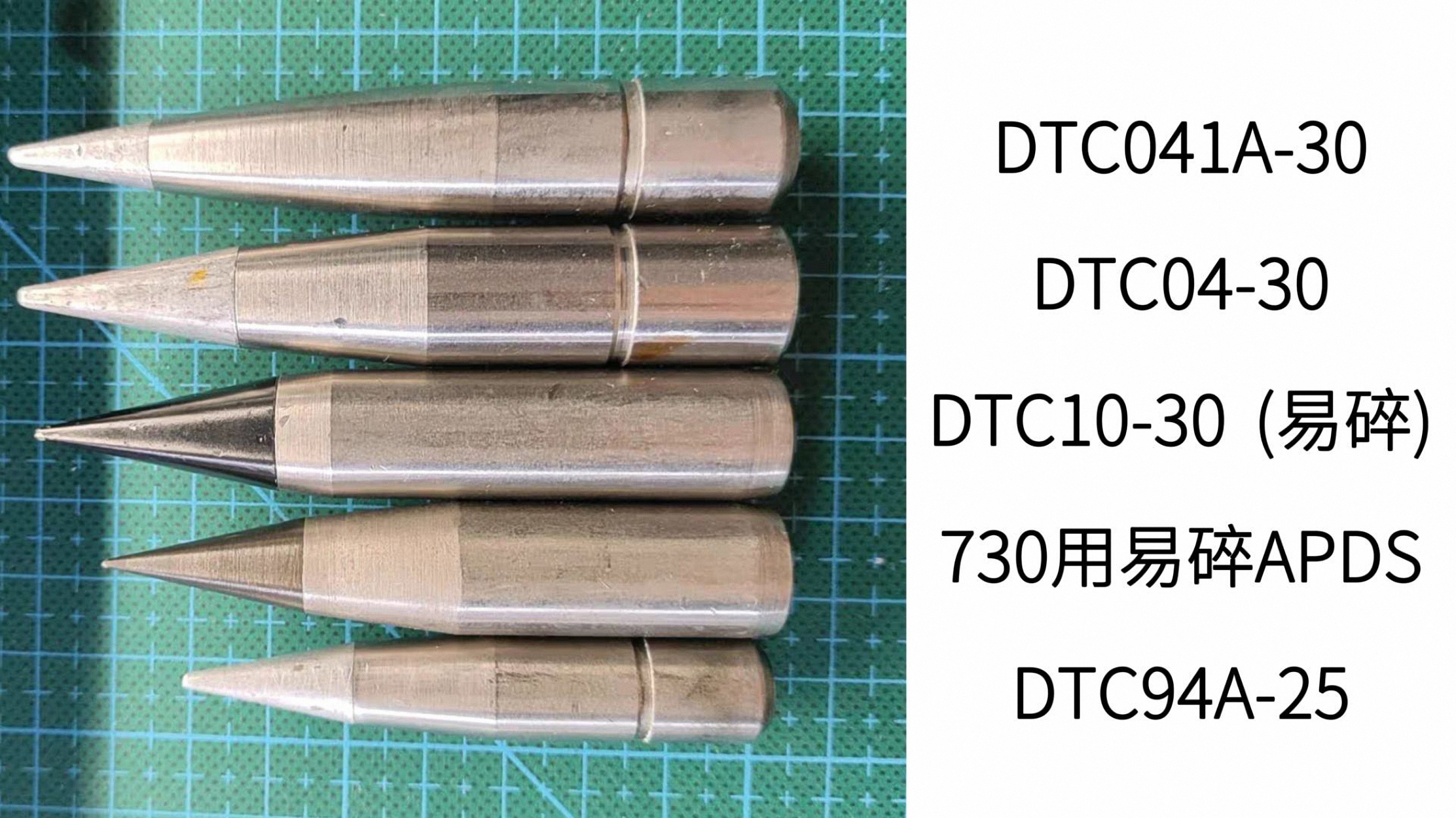 DTC04-30 APDS、DTC10-30 易碎APDS、DTY02-30杀爆燃弹,APDS实弹弹芯有弹托包裹,只露出一小段风帽,看风帽很细,像钢针,实则弹芯很粗,看图4,DTY02-30杀爆燃弹是变壁厚设计;图5~6是CS/BTE1杀伤爆破曳光弹,对应毛子3УОР6,可见弹头大部分空间被曳光剂占据,炸药含量很低,PLA没装备这种弹,可能是威力太小了???DTC04-30 APDS有曳光管,严格来说应该叫APDS-T,可以起指示弹道的作用,来自B站