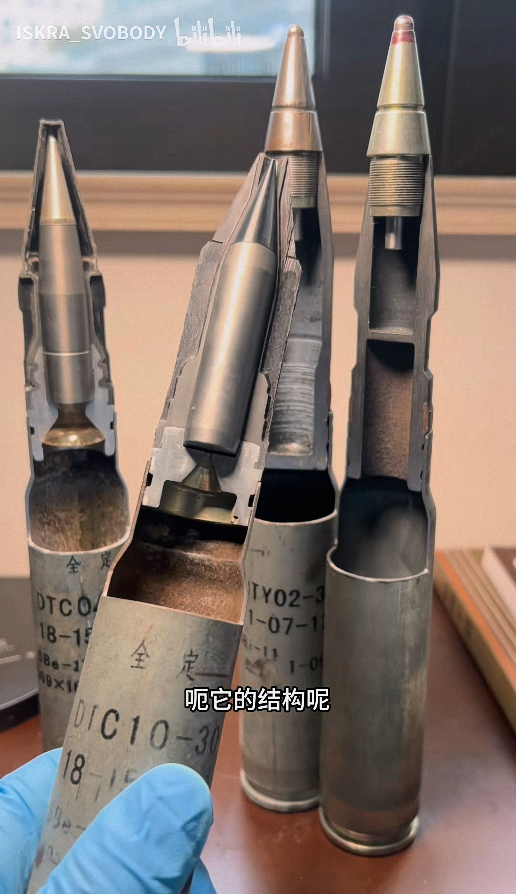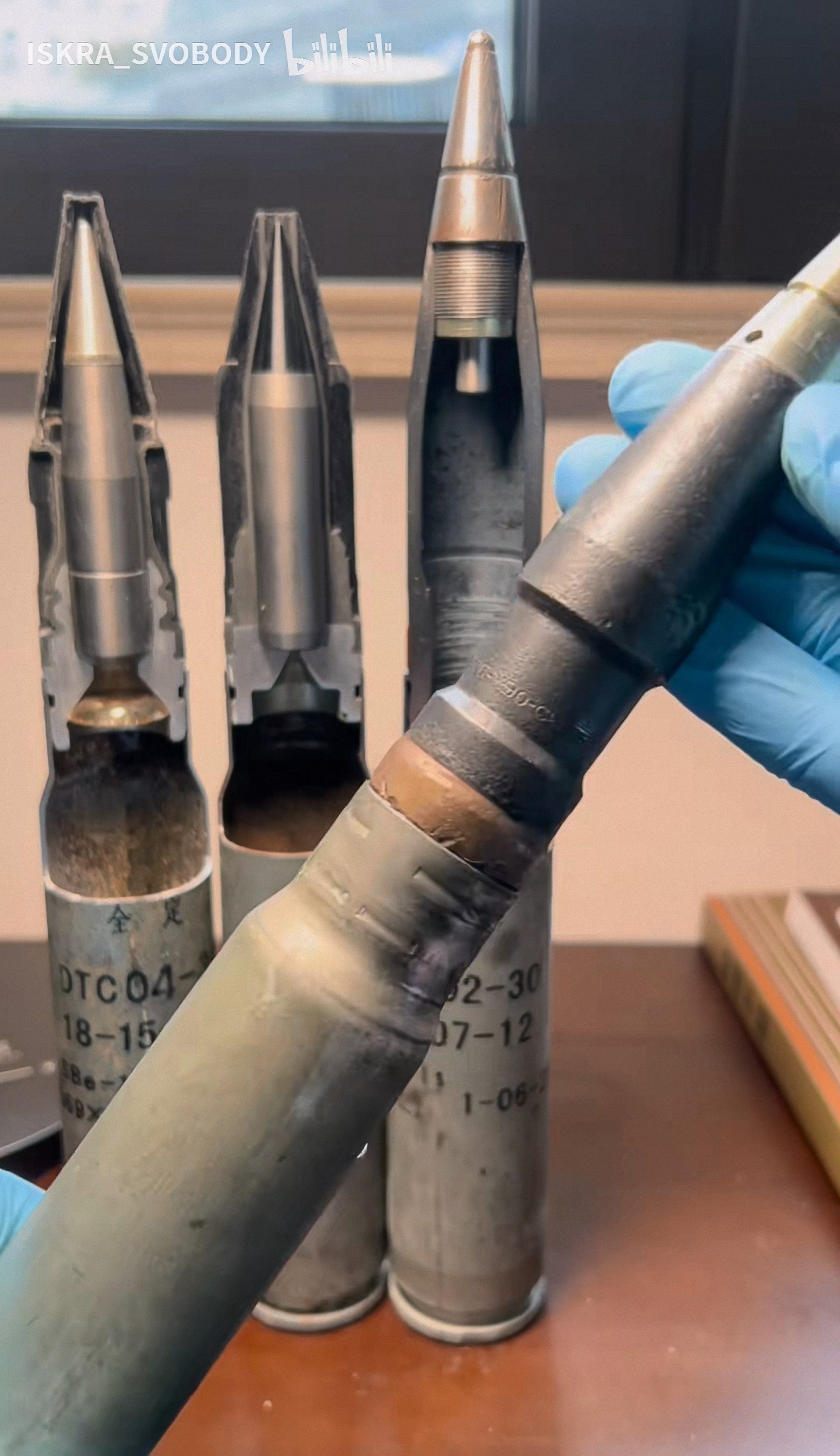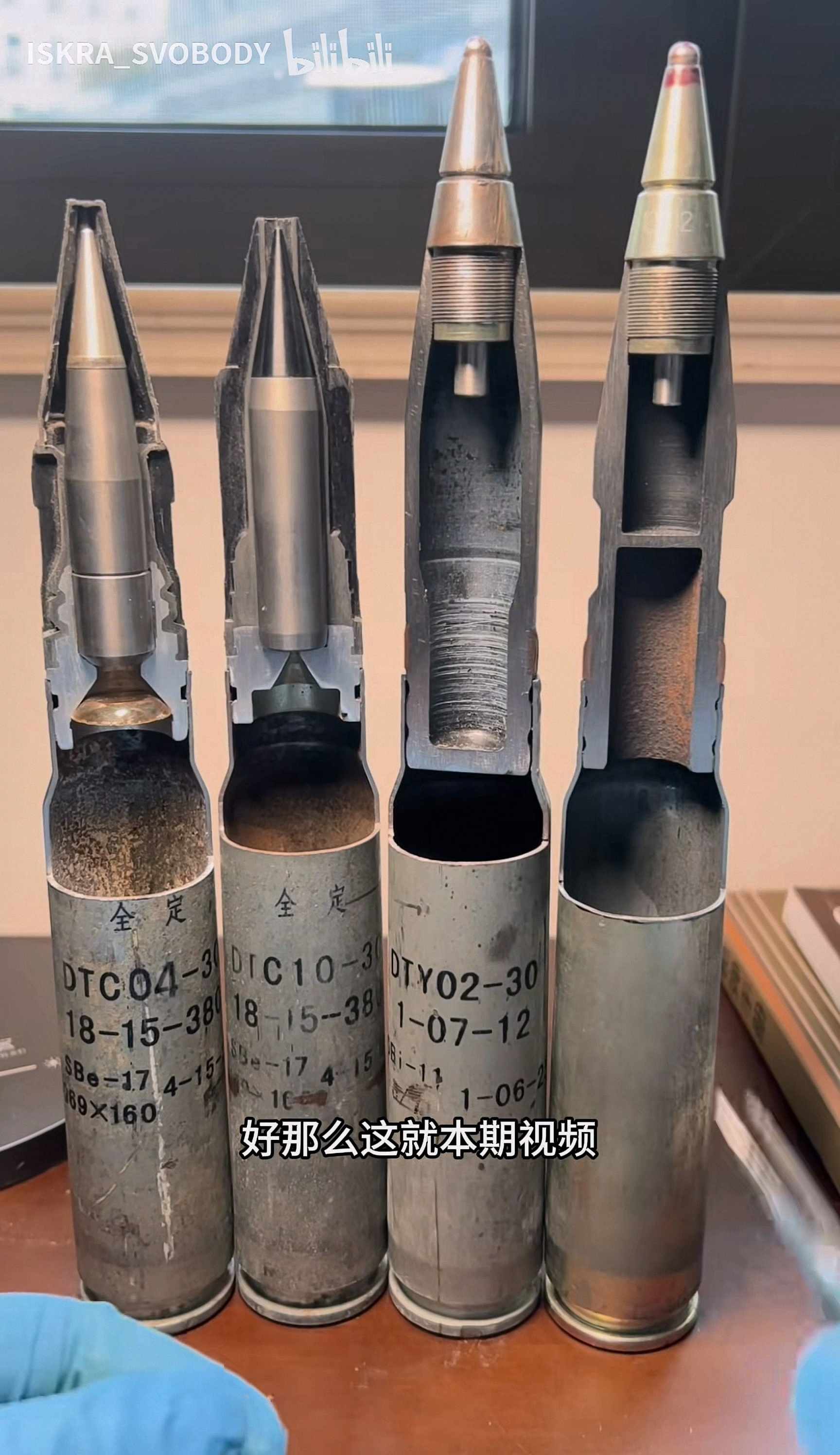 DTC04-30 APDS、DTC10-30 易碎APDS、DTY02-30杀爆燃弹,APDS实弹弹芯有弹托包裹,只露出一小段风帽,看风帽很细,像钢针,实则弹芯很粗,看图4,DTY02-30杀爆燃弹是变壁厚设计;图5~6是CS/BTE1杀伤爆破曳光弹,对应毛子3УОР6,可见弹头大部分空间被曳光剂占据,炸药含量很低,PLA没装备这种弹,可能是威力太小了???DTC04-30 APDS有曳光管,严格来说应该叫APDS-T,可以起指示弹道的作用,来自B站