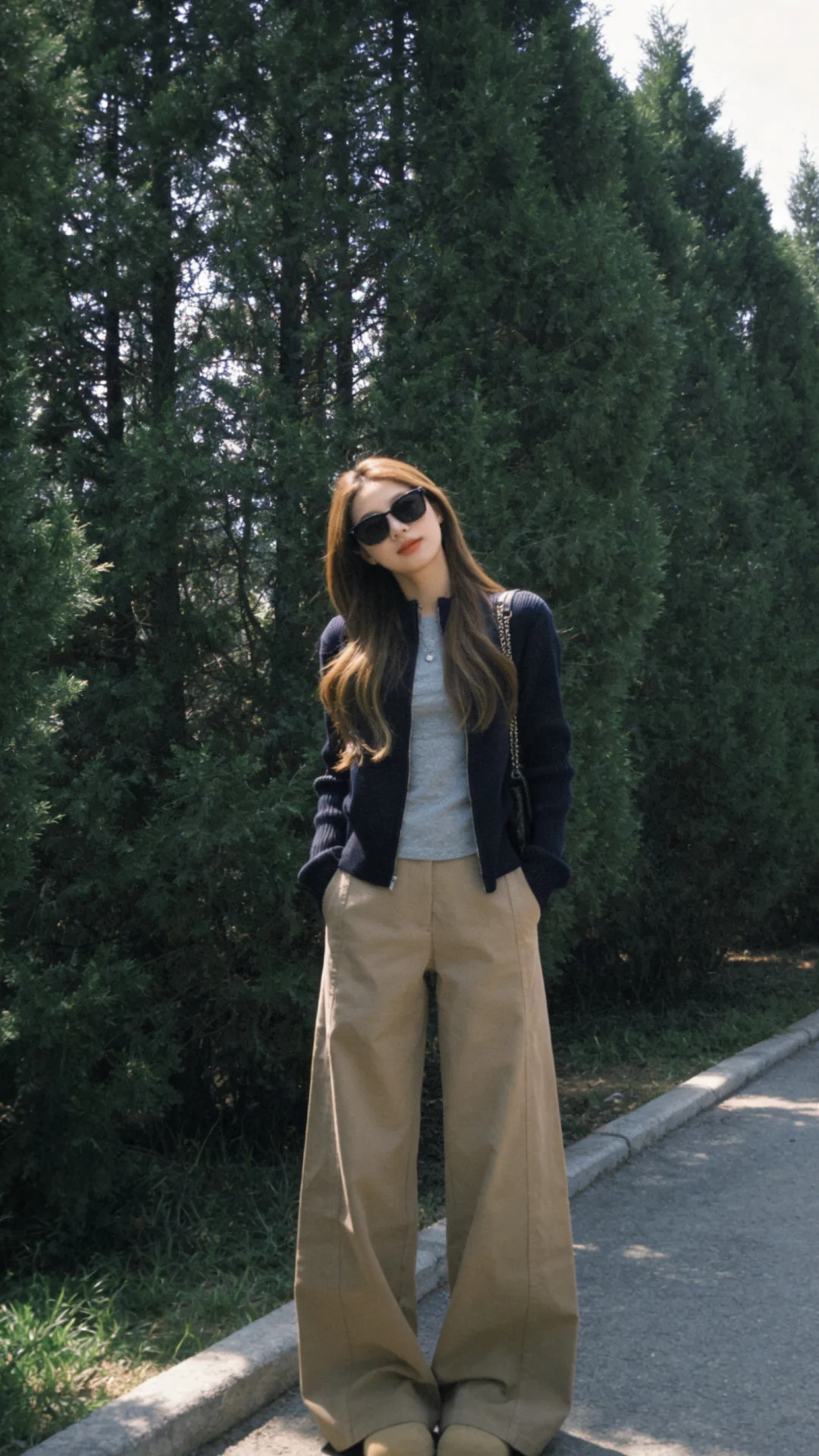 宣璐藏蓝套装太会穿宣璐这套藏蓝套装真的绝!✨白色内搭+同色系夹克阔腿裤,