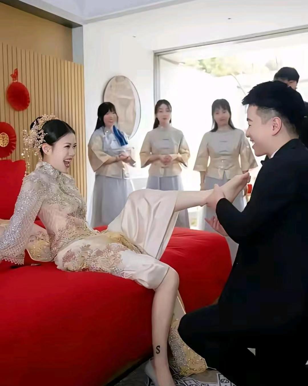 有谁知道 这新娘腿上 纹的S是啥意思吗? 新郎给新娘穿鞋时笑到劈叉,我放大一看
