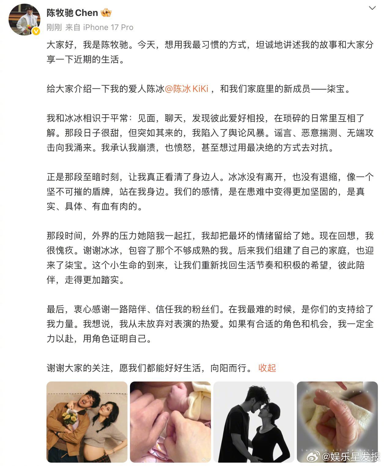 陈牧驰陈冰官宣结婚生子今日,陈牧驰用一篇长文坦诚交代近况,与陈冰在平凡日常中相识,如今也迎来家庭新成员。陈牧驰感谢陈冰的陪伴包容,也心怀粉丝的支持,依旧怀揣对演艺事业的热爱,承诺未来会踏实前行!陈牧驰感谢陈冰陪伴自己